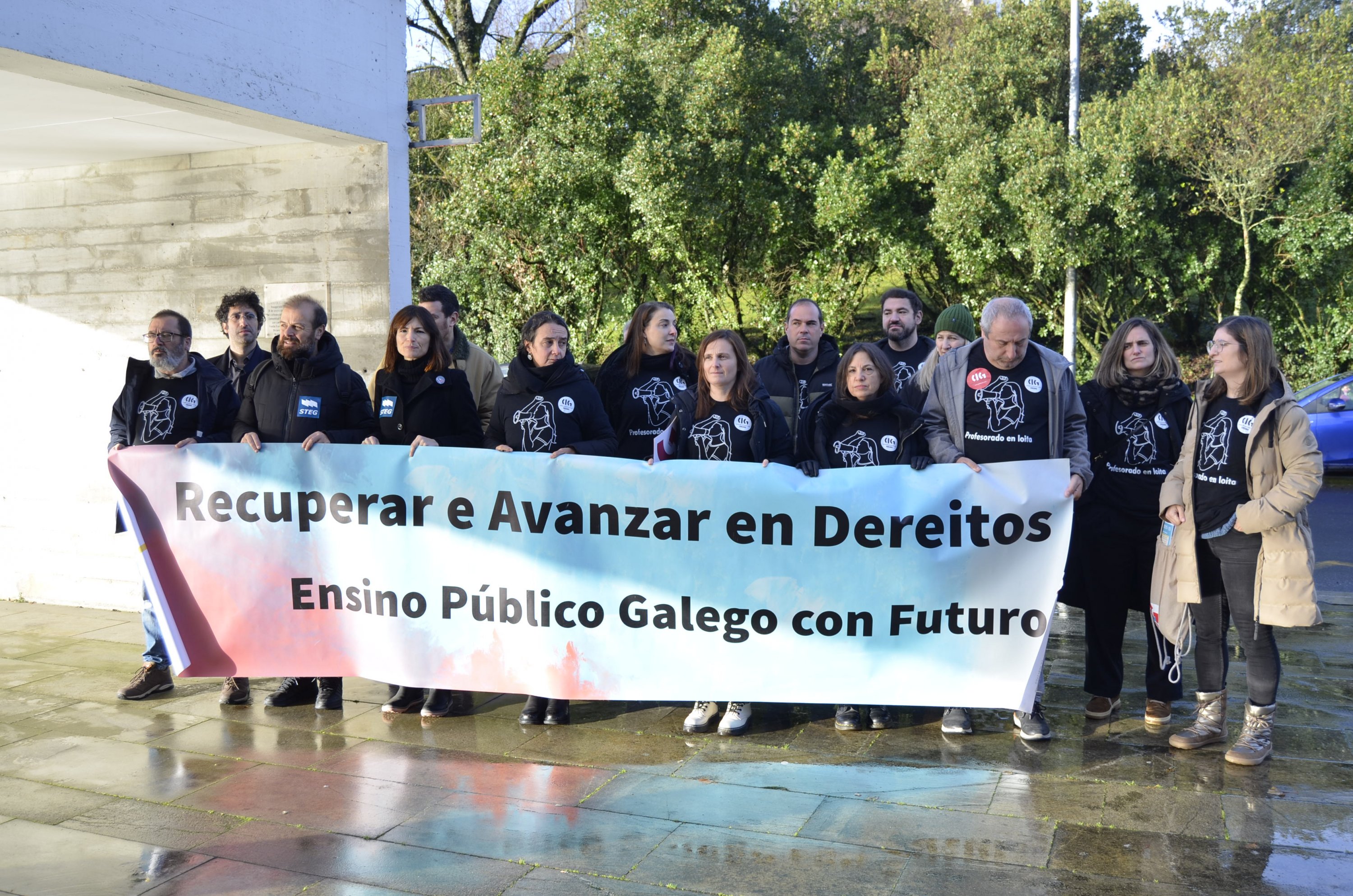 A CIG-Ensino e STEG, que representan a maioría do profesorado galego, deron hoxe un paso máis para intentar desbloquear o inicio dunhas negociacións que permitan recuperar os dereitos recortados ao persoal docente nos últimos 15 anos e avanzar noutros que demanda imperiosamente a comunidade educativa, como a baixada de ratios ou a maior dotación de especialistas para atender a diversidade. Ante o mutismo da Consellaría tras dous meses de mobilizacións e a convocatoria doutras dúas xornadas de folga para os días 16 e 17 de decembro, esta mañá un grupo de delegados e delegadas sindicais concentráronse en silencio, emulando o que recibiron por parte da Consellaría de Educación neste tempo, diante do Pazo de Congresos de Santiago a onde acudiu Román Rodríguez a clausurar unhas xornadas.