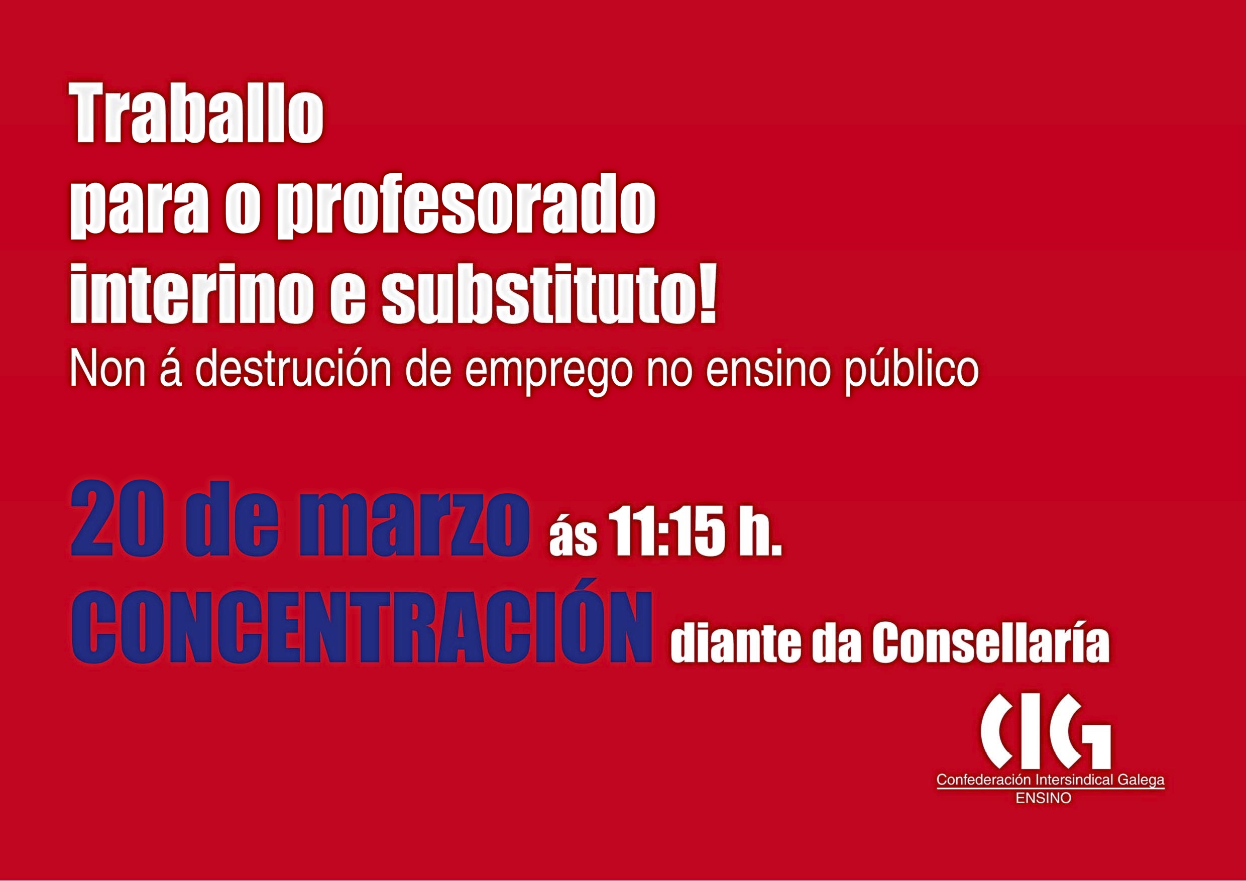 Concentración o 20 de marzo diante da Consellaría para exixir traballo para o profesorado interino e substituto