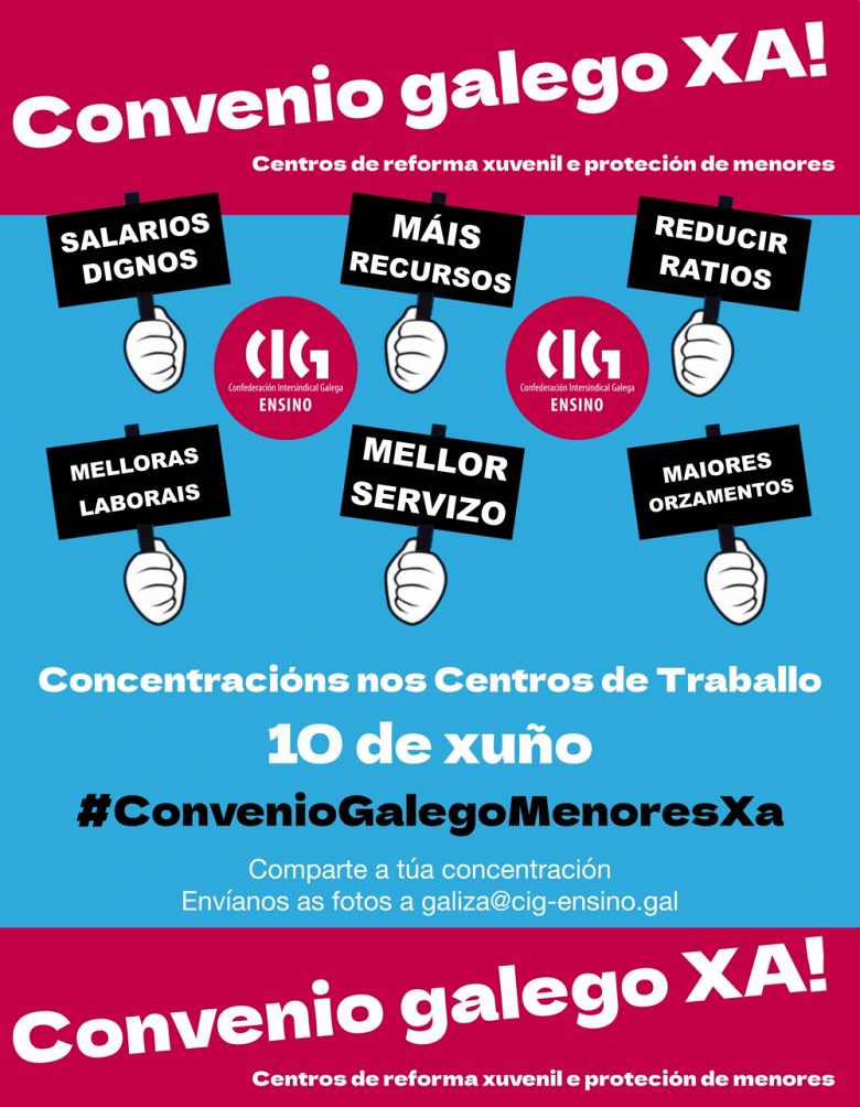 - Facer asembleas informativas e/ou repartos en todos os centros do sector, entre os traballadores e traballadoras, para rematar coa convocatoria de concentracións diante dos centros de traballo o próximo día 10 de xuño e unha ampla divulgación de fotos e vídeos nas redes sociais co hashtag #ConvenioGalegoMenoresXa e mandalas co nome do centro ao correo galiza@cig-ensino.gal. As concentracións poden ser en grupos ou individuais e con cartaces reivindicativos propios ou cos modelos que vos facilitará a CIG-Ensino.