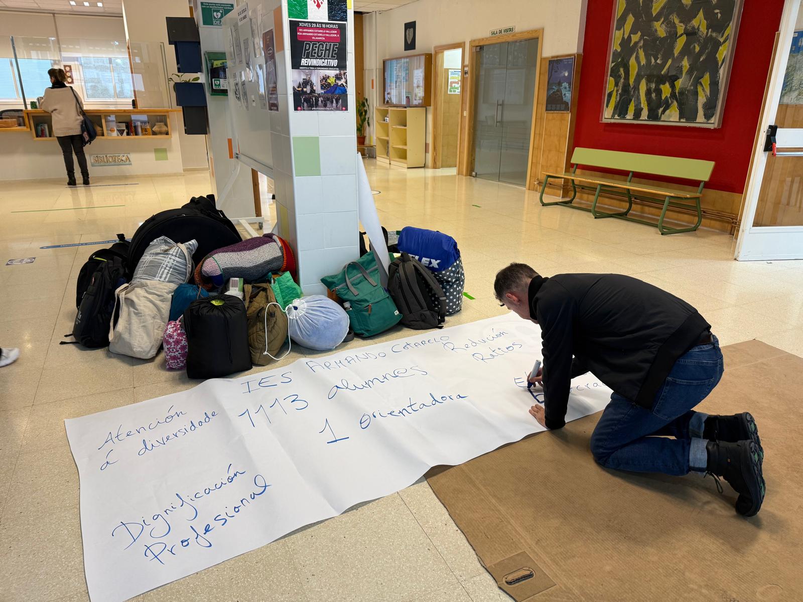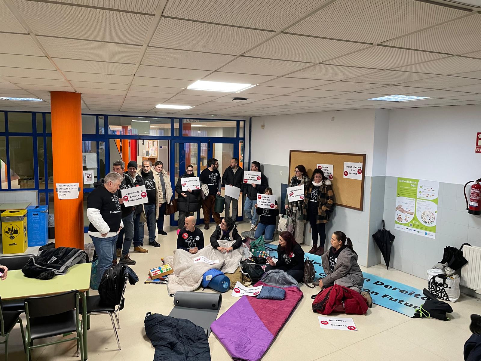 En Compostela, Ferrol e Vilagarcía delegados sindicais e profesorado pasarán a noite e mañá a primeira hora terá lugar unha concentración (tamén en Viveiro) coincidindo co inicio da actividade lectiva á que CIG-Ensino e STEG animan a unirse a toda a comunidade educativa para visibilizar estas carencias e esixirlle á administración que atenda o clamor de familias, profesorado e alumnado.