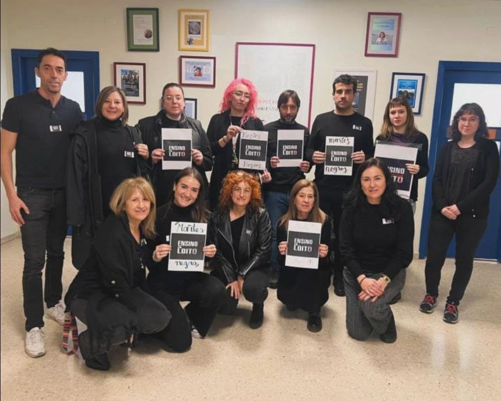 Por outra banda, hoxe foi o segundo día no que tivo lugar esta acción consistente na visibilización nos propios centros de ensino das necesidades máis acuciantes que ten o sistema educativo galego para ofrecer un servizo público de calidade. “Martes en loita” bebe do que xa viñan facendo algúns centros desde comezos de curso, e tamén algunhas Anpas. Consiste en que o profesorado vista de negro ou con mensaxes reivindicativas para chamar a atención de alumnado e das familias sobre os problemas para atender correctamente todas as necesidades que hai nas aulas, a excesiva burocratización do ensino ou a falta de negociación e de interlocución coa Consellaría en aspectos chave para o bo funcionamento do sistema educativo. O vindeiro martes, a CIG-Ensino chama a que esta acción se visibilice conxuntamente en toda Galiza coa organización de concentracións en todos os centros e a súa difusión a través das redes sociais e dos medios de comunicación locais.