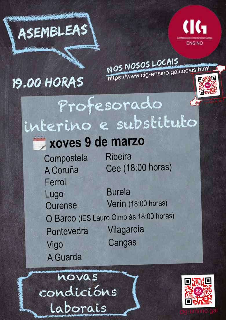Calquera dúbida, calquera pregunta... non o dubides acode ás asembleas abertas convocadas pola CIG-Ensino para o xoves 9 de marzo, ver horas e lugares no cartaz anexo.