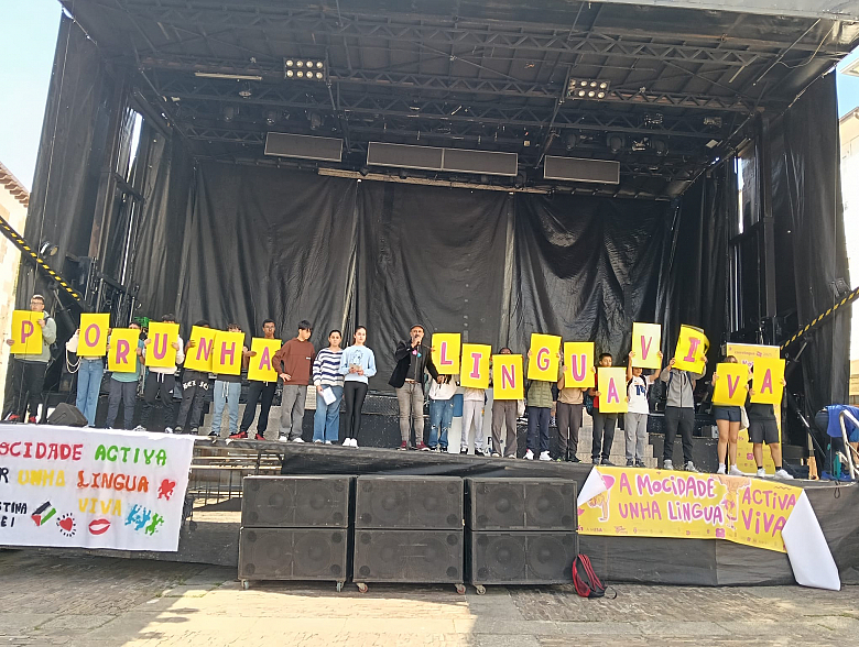 Unha vez rematada a marcha, o alumnado dos IES Perdouro de Burela e San Rosendo de Mondoñedo subían ao palco para ler o manifesto deste ano. A súa participación no Obradoiro Desata a Lingua para elaborar este texto foi valorada como moi positiva tanto polos centros como pola organización do Correlingua.