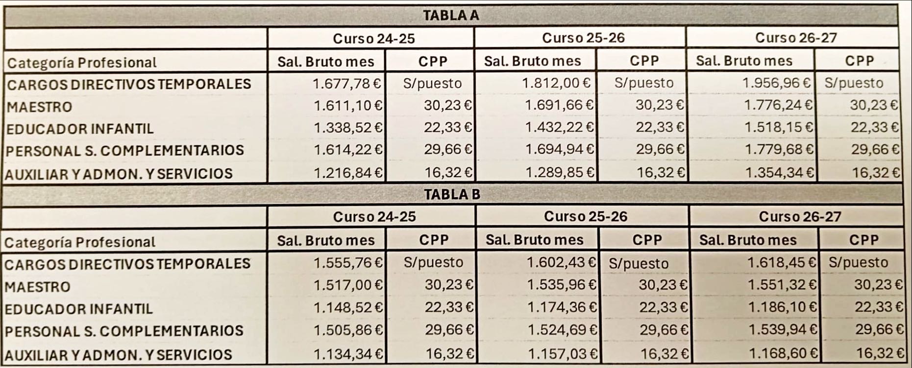 2º - Mantense a discriminación salarial na xestión indirecta (XI), coas táboas a dúas marchas, que nunca compartimos na CIG e que de levarse a cabo, debe crearse un "complemento compensador" entre novos e antigos pregos de contratación (táboas A e B), que evite ou minimice a perda salarial entre unhas e outras. As traballadoras que cobraron no anterior convenio polas táboas baixas (B), ben saben o que é, pois só igualaron ao remate do convenio ao confluír as dúas táboas (confluencia que agora non queren recoller as patronais). Deste xeito mentres que nos novos pregos unha educadora cobrará dende setembro deste ano, 1.338,52€, outra educadora que non teña novos pregos cobrará 1.148,52€ (suba ridícula, que pasa a 1174,36 a setembro do 2025 e a 1186,10€ en setembro do 2026).