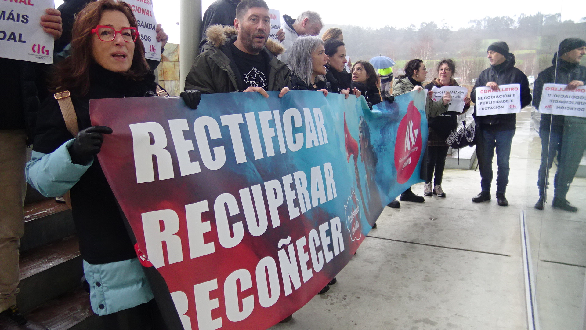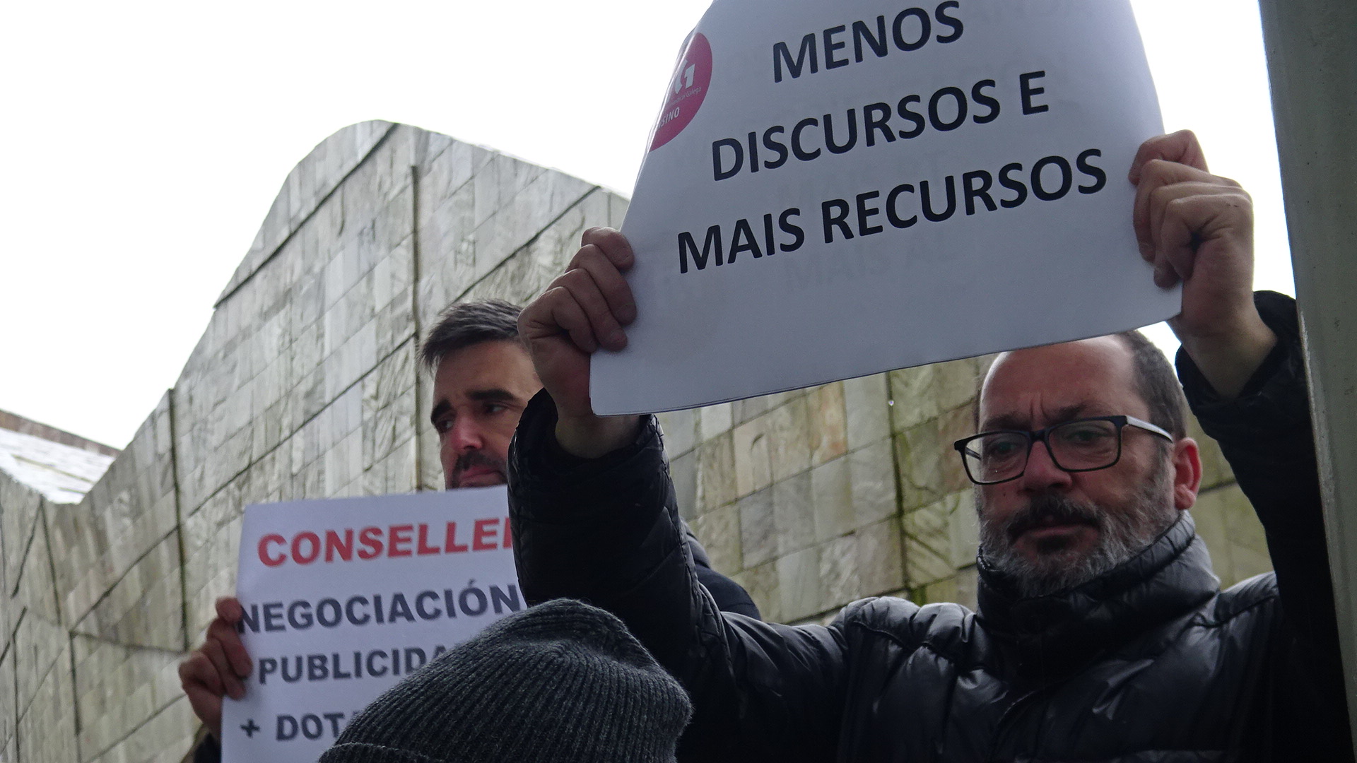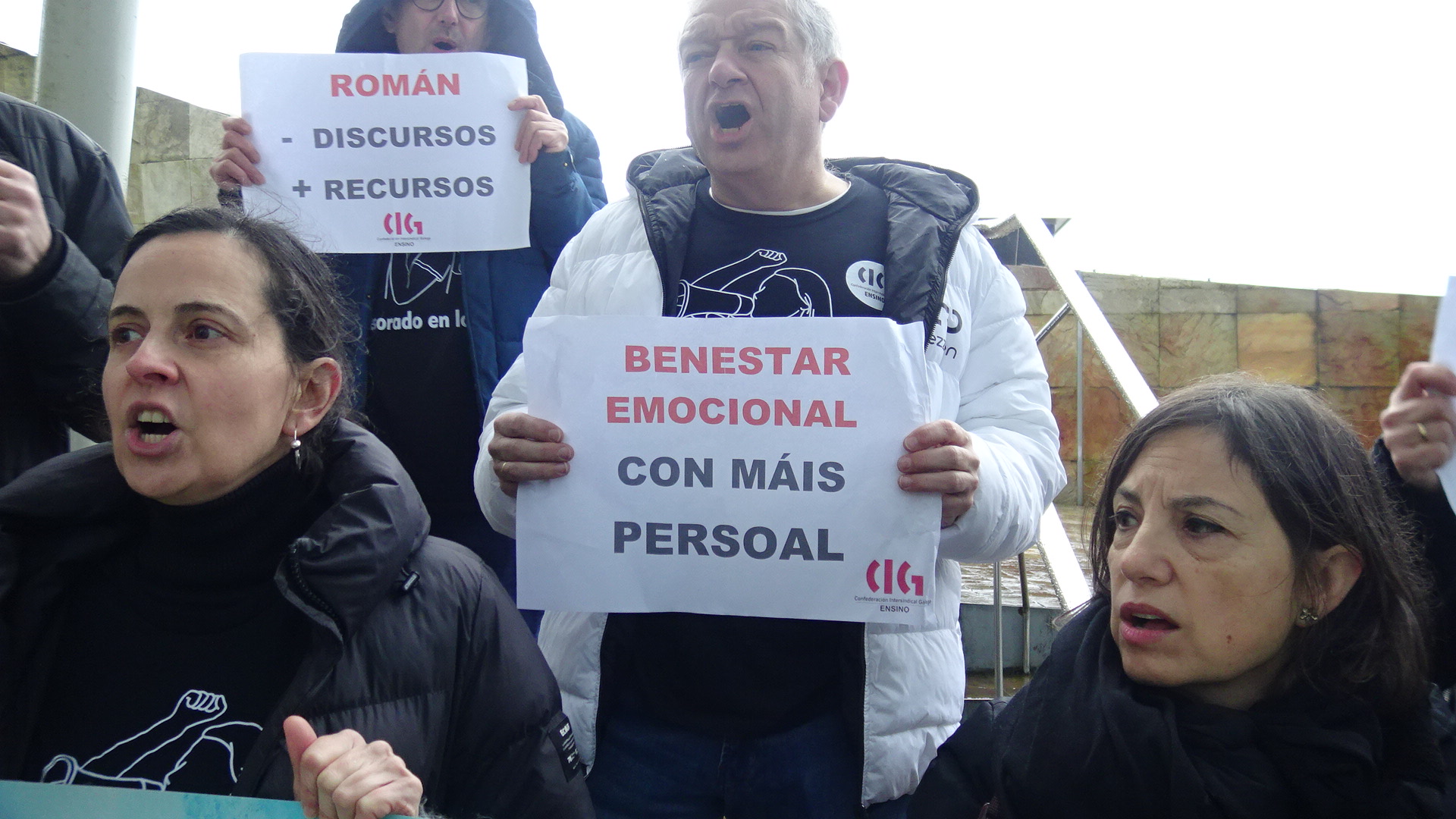 Ás dez da mañá no Edificio Fontán da Cidade da Cultura daba comezo a presentación do Plan de Benestar Dixital a cargo do conselleiro de Educación e de varios altos cargos do seu departamento. Un grupo de delegados e delegadas da CIG-Ensino concentrouse ás portas da sala de eventos para “visibilizar que queremos comezar unha negociación para mellorar as condicións laborais do profesorado”, en palabras de Diego Boquete, responsábel de Acción Sindical. “Non nos serve o marco de negociación da comisión de seguimento do chamado Acordo de Melloras, que por certo os mesmos sindicatos que o asinaron o teñen denunciado nos xulgados por incumprimento, porque ademais o que quere negociar o profesorado galego está fóra dese acordo”, engadiu.