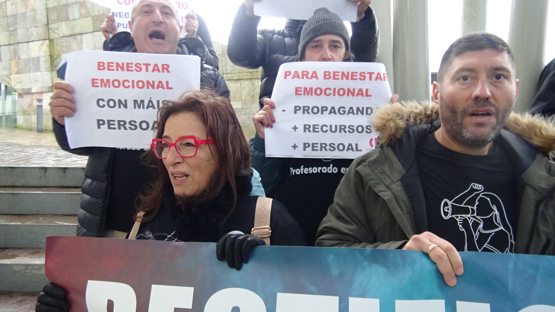 Delegados e delegadas da CIG-Ensino concéntranse durante a presentación do Plan de benestar emocional para esixir negociacións ao conselleiro