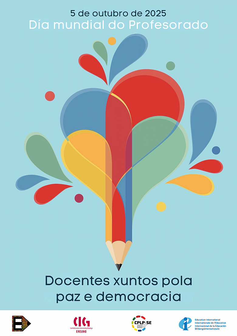 Lonxe das celebracións rituais que propoñen as institucións educativas que padecemos, caracterizadas polo desprezo cara a figura do profesorado -a quen recorta condicións, dereitos e medios-, desde a CIG-Ensino queremos, xunto con organizacións sindicais irmáns da lusofonía (territorios onde ten presenza o tronco lingüístico galego-portugués), fuxir de abstraccións e “lugares comúns” que nos pretenden anestesiar no acriticismo, inmobilismo e pensamento único e conmemorar o Día Mundial do Profesorado este 5 de outubro baixo o lema “Paz e Democracia”.