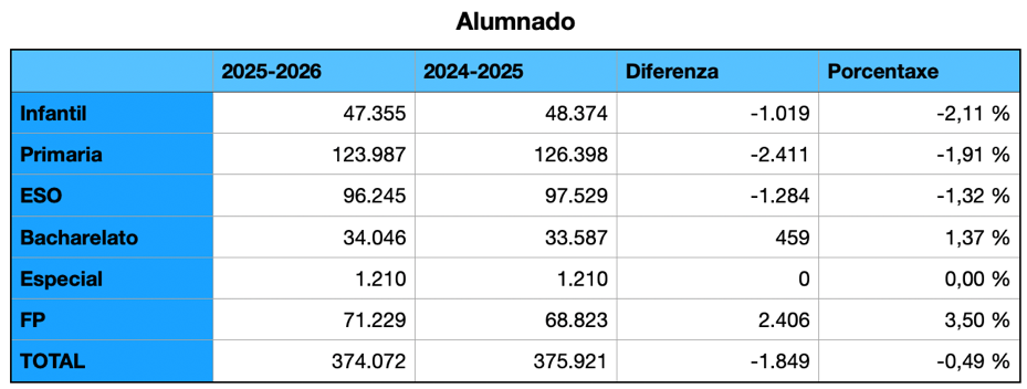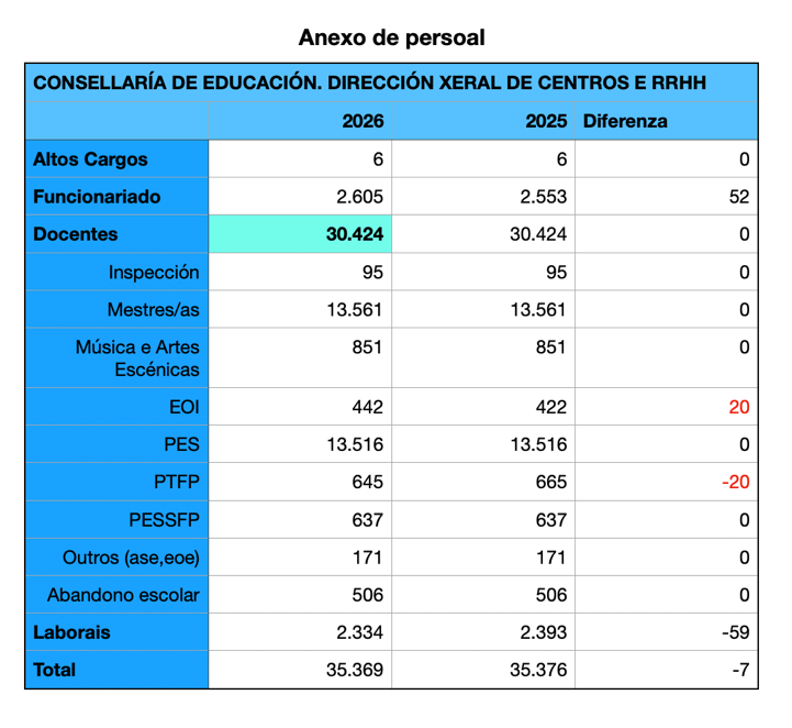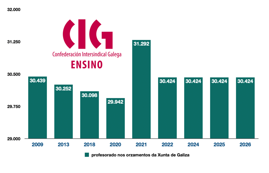 Con todo, para Arroxo o que é máis chamativo é que segue orzamentado o mesmo número de docentes, 30.424, que os últimos catro anos, desde 2022 tras a pandemia na que si se reforzara o persoal docente.
