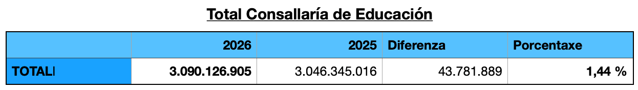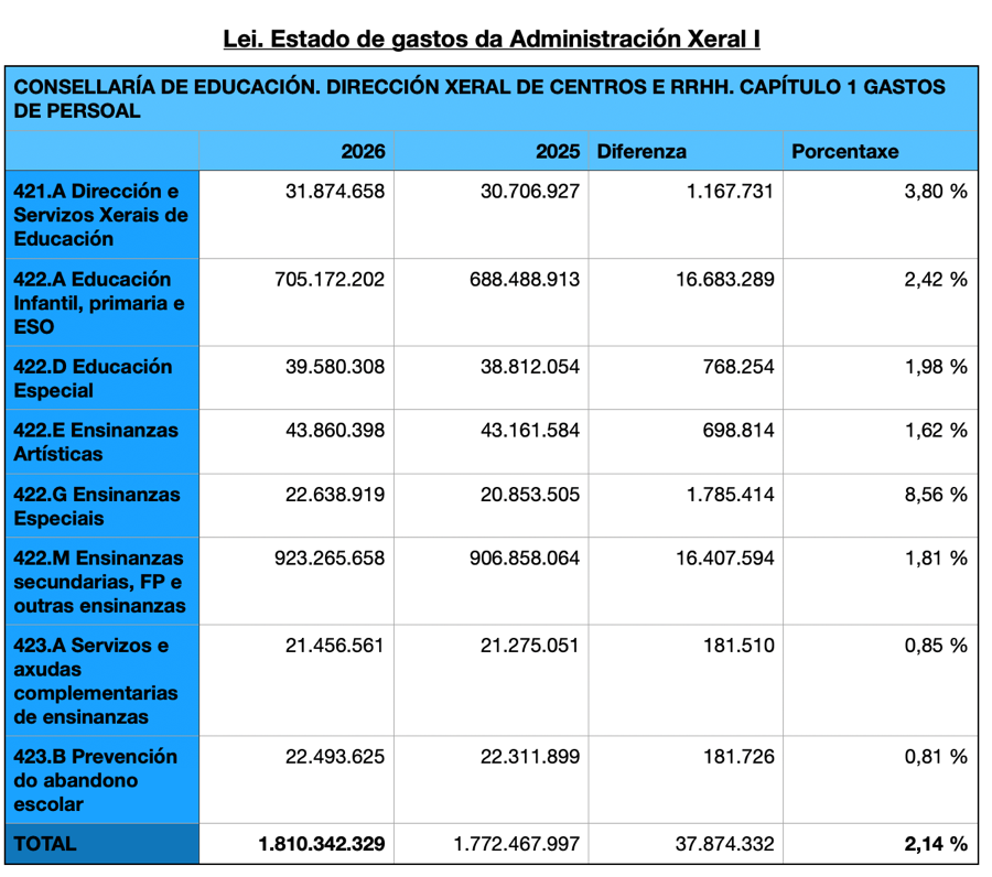 Mais o capítulo que realmente se debe mirar con lupa é o do gasto en persoal, aínda que non todo el é profesorado. Segundo o documento presentado no Parlamento pola Xunta, de cara ao vindeiro ano soben as partidas para gastos de persoal en 37,9 millóns, o que supón un 2,14% máis que no 2025, e fano distribuídas do seguinte xeito: