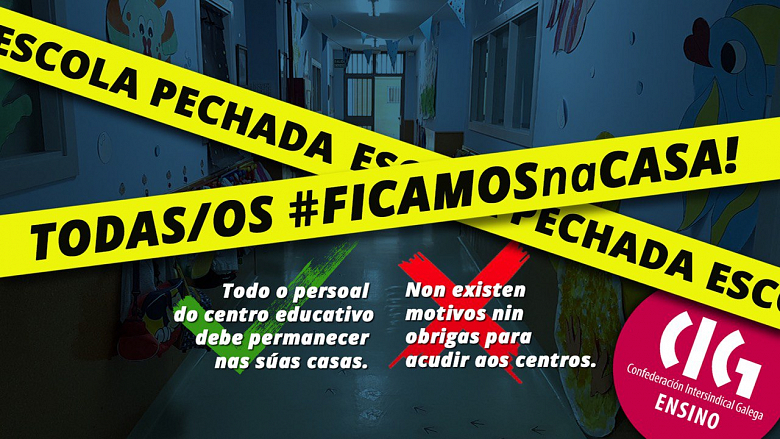 Desde o comezo da emerxencia sanitaria e o estado de alarma na CIG-Ensino tivemos claro que o profesorado galego así como todo o persoal que traballa nos centros educativos, unha vez pechados estes, tiña que quedar na casa e así llo fixemos ver á Consellaría de Educación, na mesma liña que o sindicato vén defendendo de paralizar todas aquelas actividades económicas que non sexa imprescindíbeis.