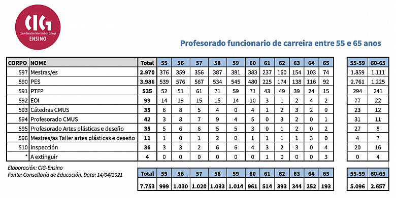 Tendo en conta as xubilacións producidas nestes últimos anos, que xa implicaron unha muda importante de profesorado, as cifras que podemos observar no estudo feito pola CIG-Ensino a partir dos datos proporcionados pola administración educativa, deixan clara a importancia do relevo no profesorado galego. Tendo en conta unhas cifras de funcionariado de carreira que rolda os 27 ou 28.000 (dato non proporcionado pola Administración -por algo máis de 5700 docentes interinos-), temos unha porcentaxe superior ao 25% que ten entre 55 e 65 anos (7.753 segundo os cómputos da administración) que poden xubilarse nos próximos anos. Hai tamén profesorado interino, con cifras e porcentaxes moi inferiores que poden estar nesta situación, mais desde o sindicato centramos o estudo no que ten carácter fixo xa que son as súas prazas, coas limitacións actuais das taxas de reposición -persoas que se xubilan- as que poden indicar futuras ofertas de emprego público.