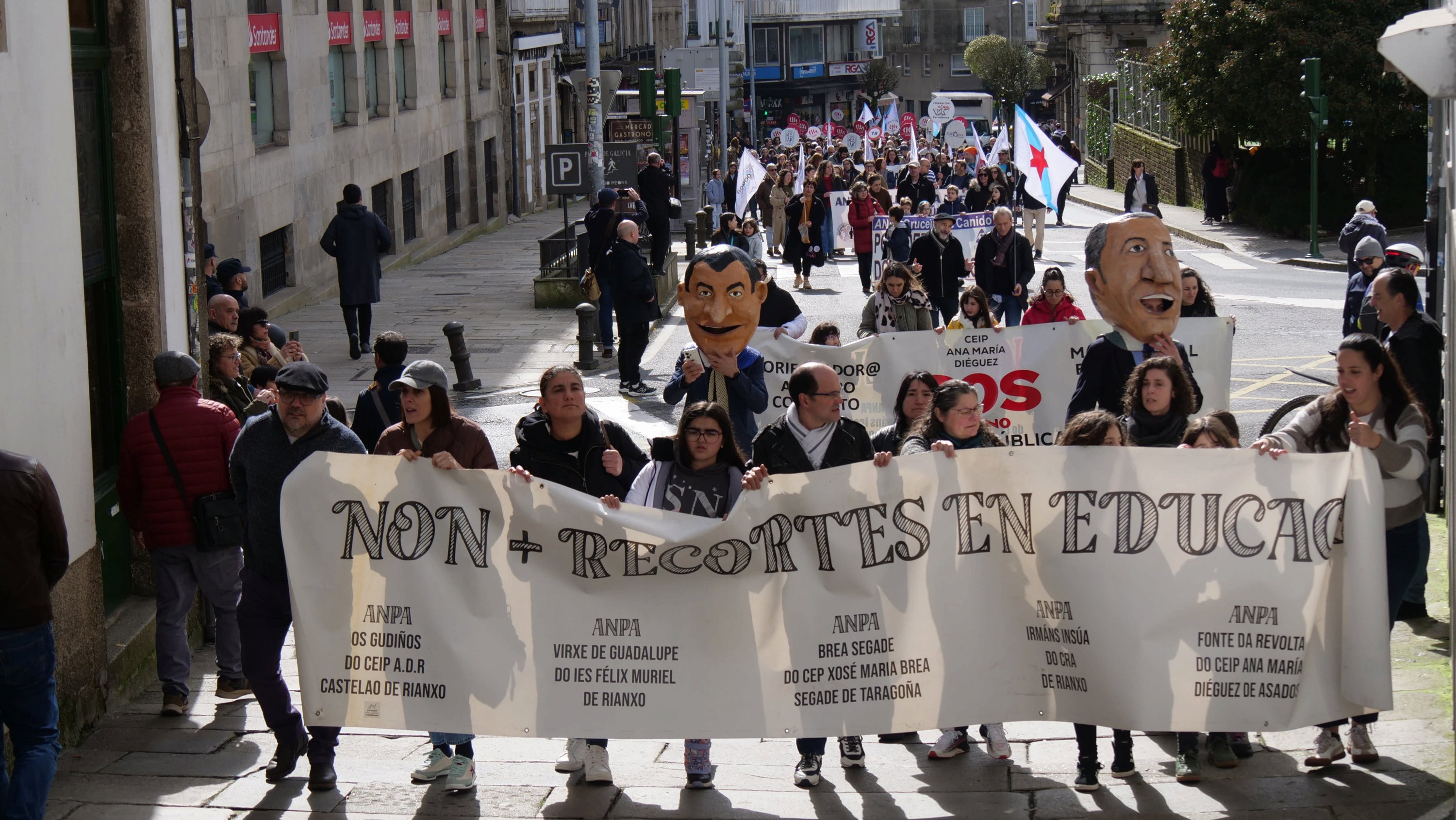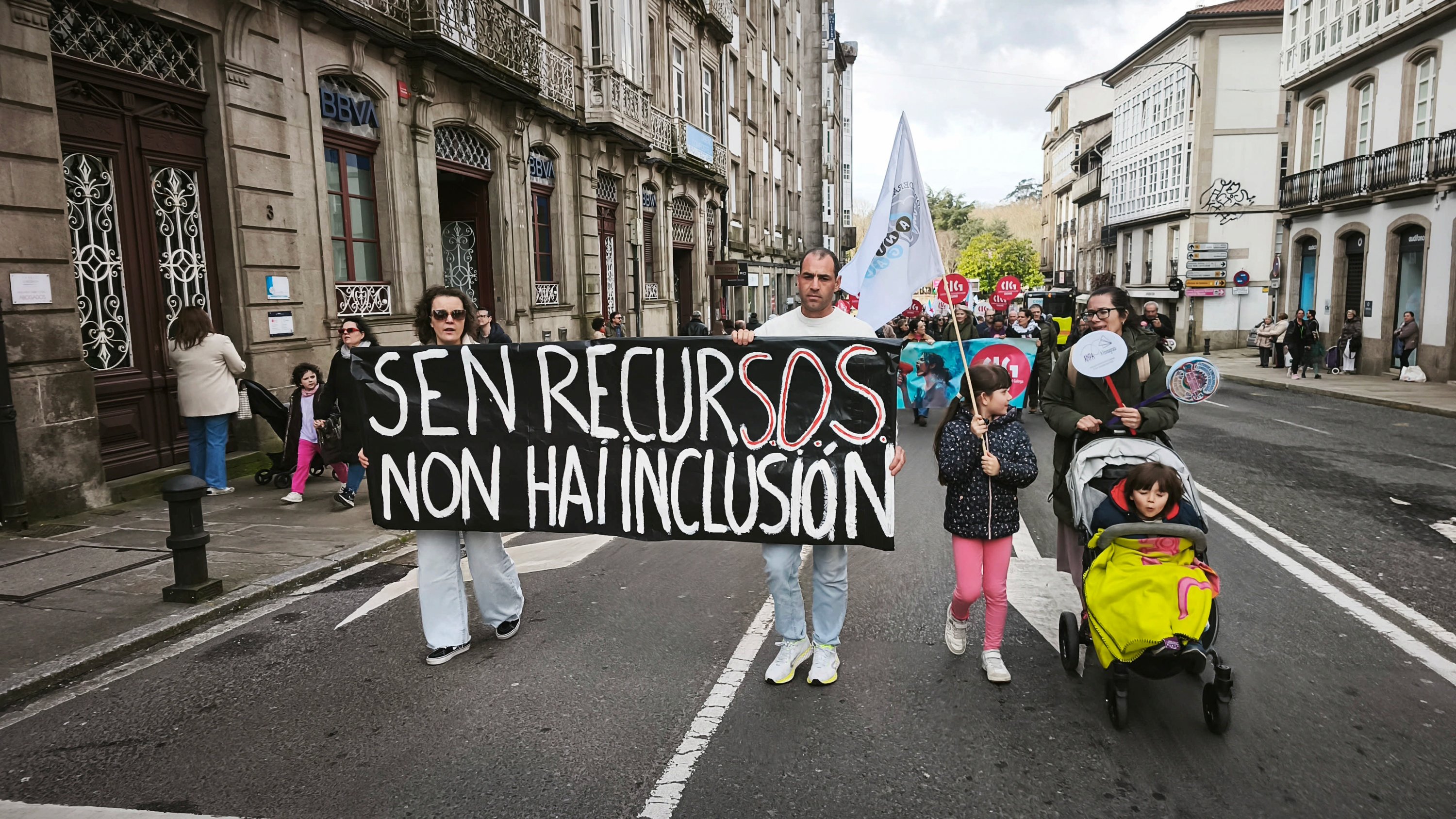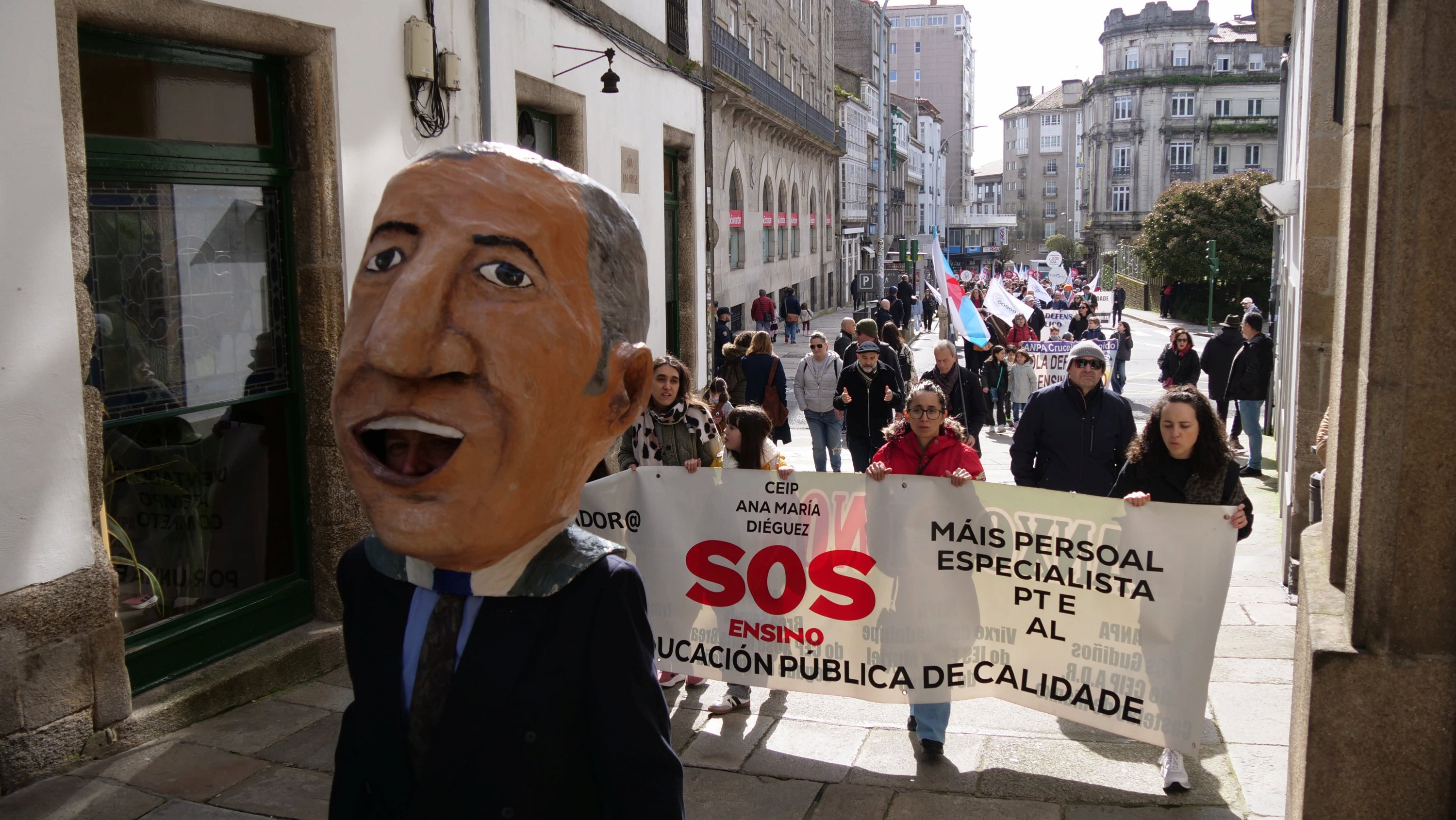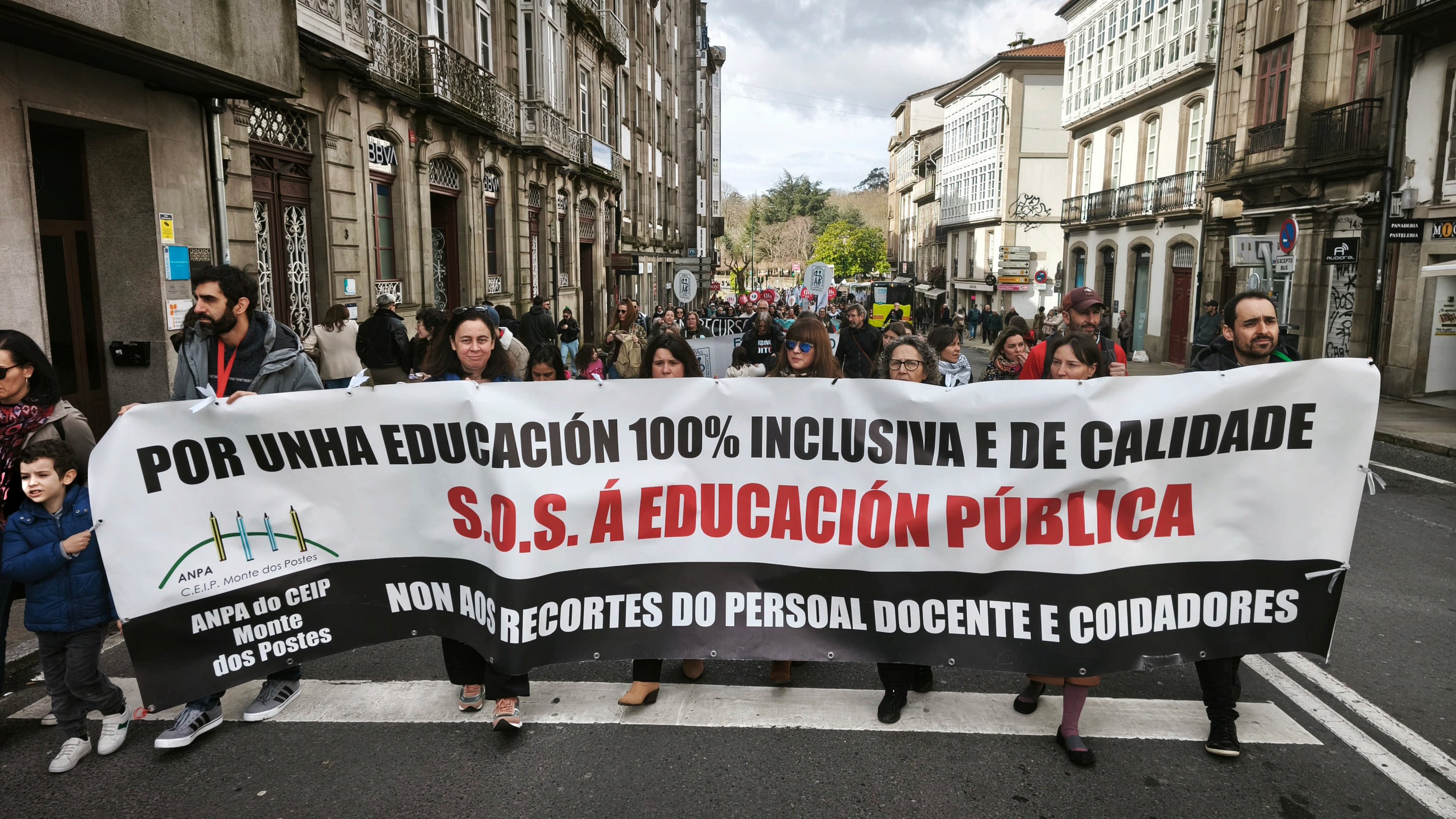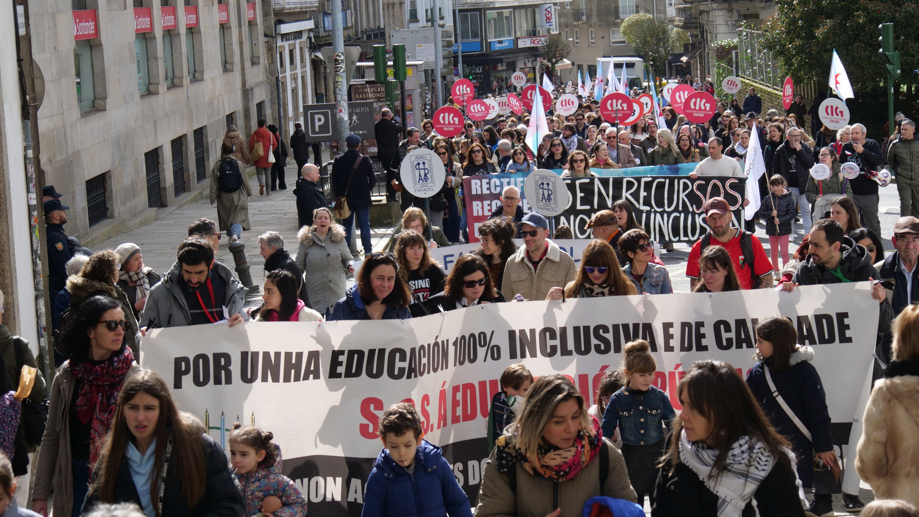 A marcha, impulsada por Anpas Galegas, contou coa asistencia de miles de persoas que corearon consignas como “menos ratio, máis profesorado”, “máis inclusión, máis inversión”, “sen recursos, non hai inclusión” ou “onde están que non se se ven? as orientadoras, AL e PT”. Con pancartas nas que se podían ler as necesidades dos centros e as reclamacións das Anpas, e contando coa amenización dos cabezudos do presidente da Xunta e do conselleiro de Educación a manifestación percorreu as rúas da capital galega para rematar na Praza de Praterías coa lectura dun manifestou a cargo da presidenta da maior confederación de Anpas do noso país. Isabel Calvete reprochou “que se estea a falar de que temos o ensino máis inclusivo do estado cando parte do alumnado galego, o máis vulnerable, está desprotexido. Non se respecta o seu dereito a un ensino de calidade, non se respecta o seu dereito a formar parte da súa sociedade en igualdade de condicións, porque esa igualdade constrúese sobre todo desde a escola”. Con respecto a como se senten as familias galegas indicou que “estamos fartas de palabras baleiras, de promesas incumpridas e de ter que remover ceo e terra para conseguir algo que é un dereito, fartas de que non escoiten, de escusas absurdas. E estamos moi fartas de que se fale de inclusión cando non hai tal, cando vemos como se priva ás nosas fillas e fillos dos apoios, reforzos e desdobres necesarios para súa formación”.