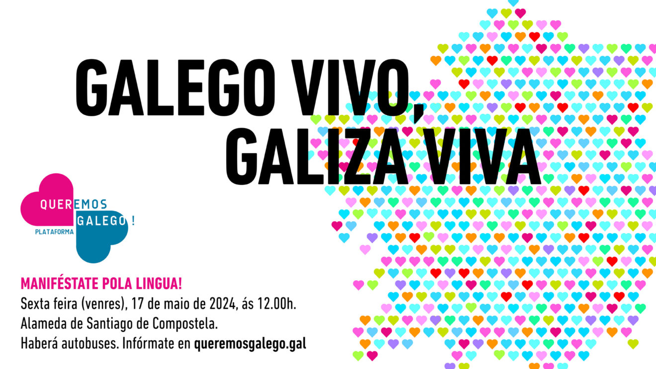 Para combater estas políticas regresoras as máis de 500 organizacións que conforman Queremos Galego animan a asinar o manifesto en defensa da nosa lingua e que fai un chamamento aos gobernos para asumiren a súa responsabilidade legal e moral co idioma, nomeadamente á Xunta de Galiza para que acompañe á sociedade que actúa cada día para ter un "galego vivo e unha Galiza viva". Precisamente este vai ser o lema baixo o que decorra a manifestación convocada para as 12 horas do día 17 de maio con saída da Alameda compostelá a finalización na Praza da Quintana e para a que se poñerán a disposición autobuses desde 8 localidades galegas. Os horarios e percorridos poden consultarse na seguinte ligazón.