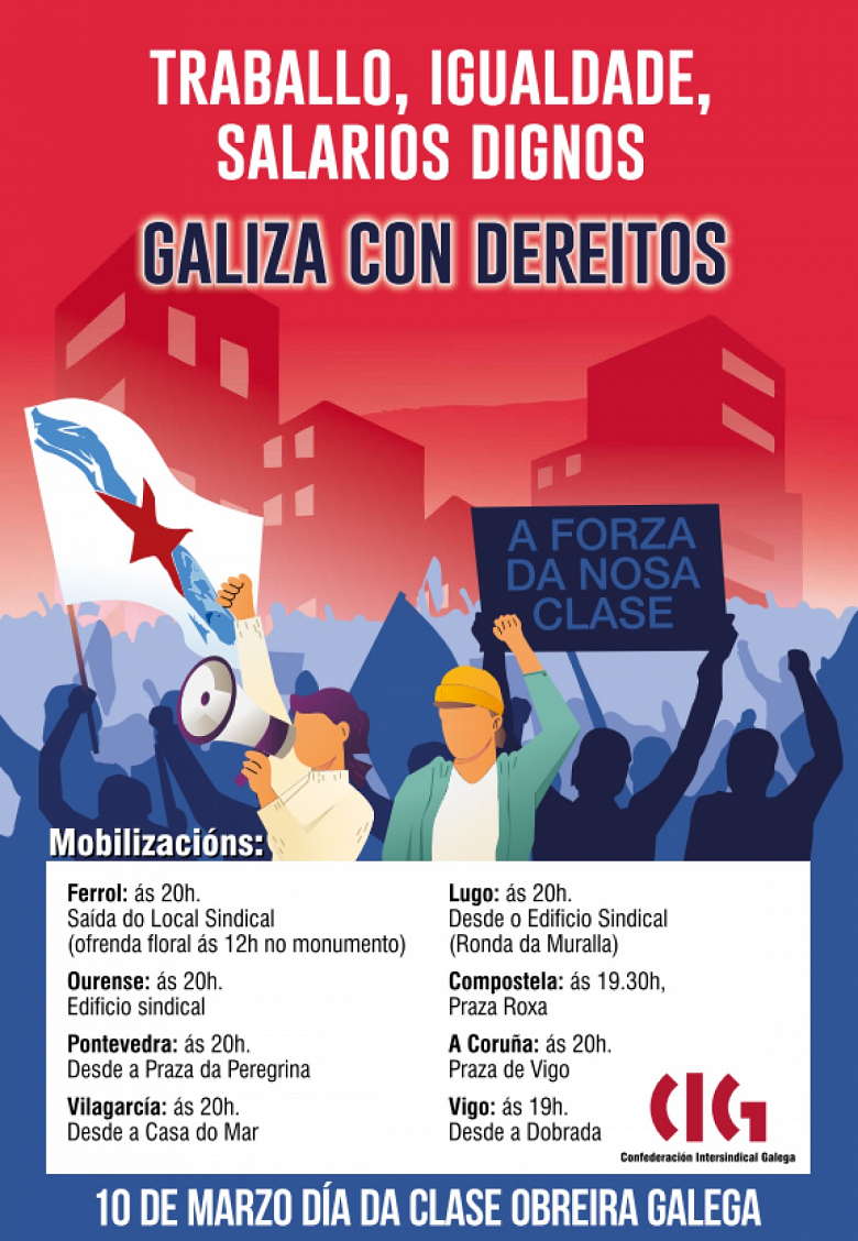 O 10 de Marzo é o Día da Clase Obreira Galega, que a CIG chama a conmemorar en todas as comarcas para reivindicar, con 12 medidas, traballo, igualdade e salarios dignos nunha Galiza con dereitos.