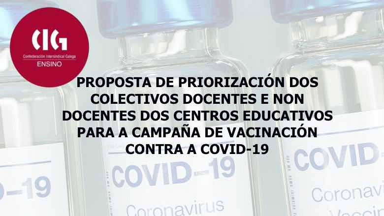 A publicación dun documento coa priorización de colectivos para a vacinación do persoal dos centros educativos nace da proposta conxunta das catro organizacións sindicais con representación na Mesa Sectorial (CIG-Ensino, CCOO-Ensino, ANPE e FeSP-UGT) logo do caos provocado pola descoordinación entre Sanidade e Educación, convocando a profesorado sen ningún tipo de criterio nin prioridade no comezo da vacinación, algo absolutamente necesario en previsión de que se poida ralentizar a campaña pola escaseza puntual de vacinas.