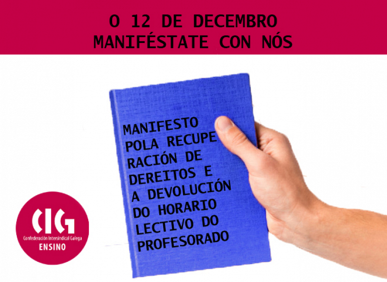 Sen sinais de que a Consellaría tomara nota do malestar e das problemáticas que sofre o profesorado galego froito das súas políticas de recortes, a folla de ruta iniciada cara á folga do ensino o 12 de decembro segue o seu camiño hoxe co lanzamento do manifesto subscrito por todas as organizacións convocantes e que será lido durante a manifestación convocada para ese día e que partirá da praza de Cervantes ás 12 da mañá.