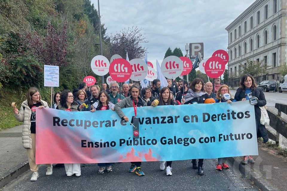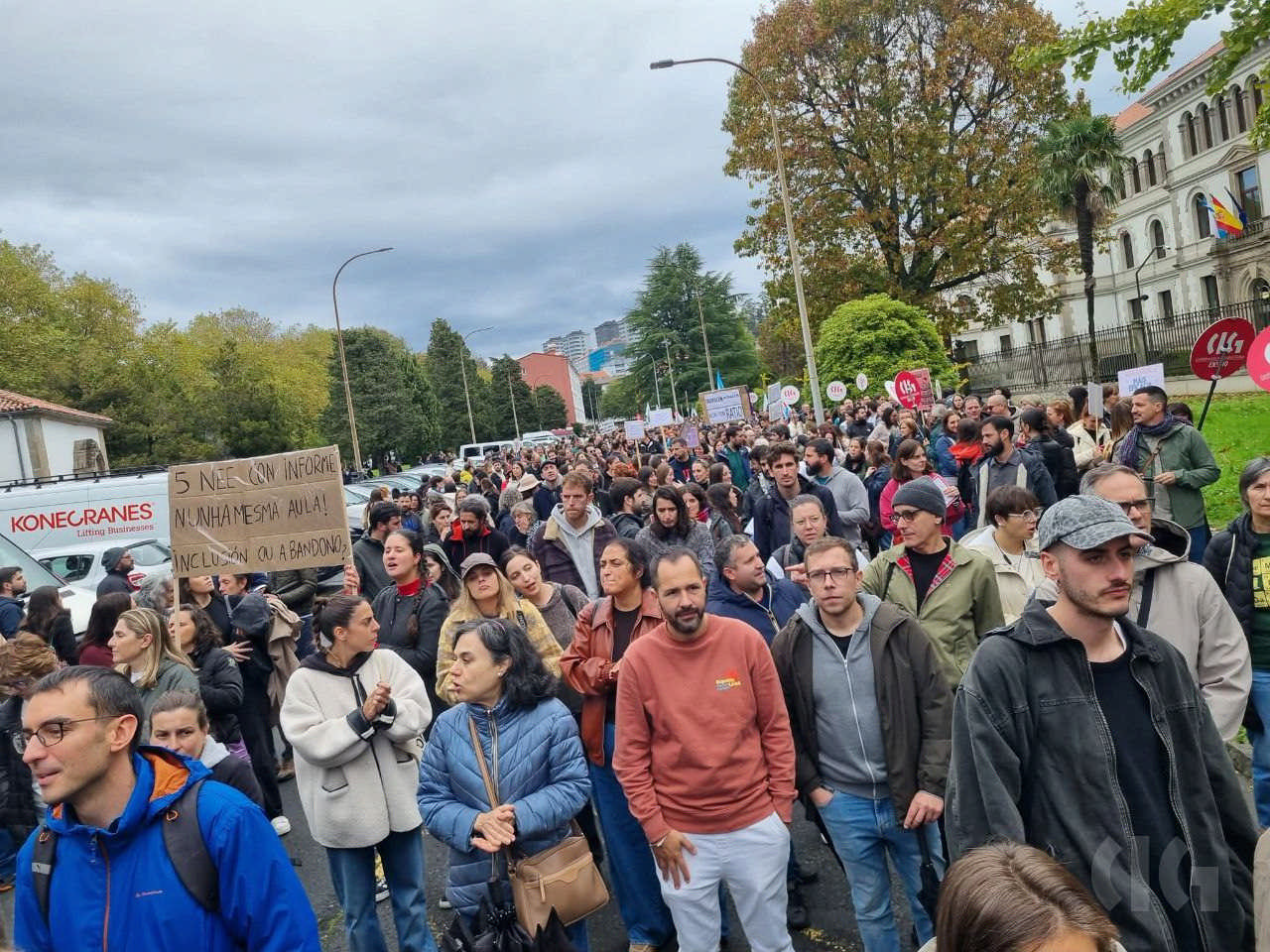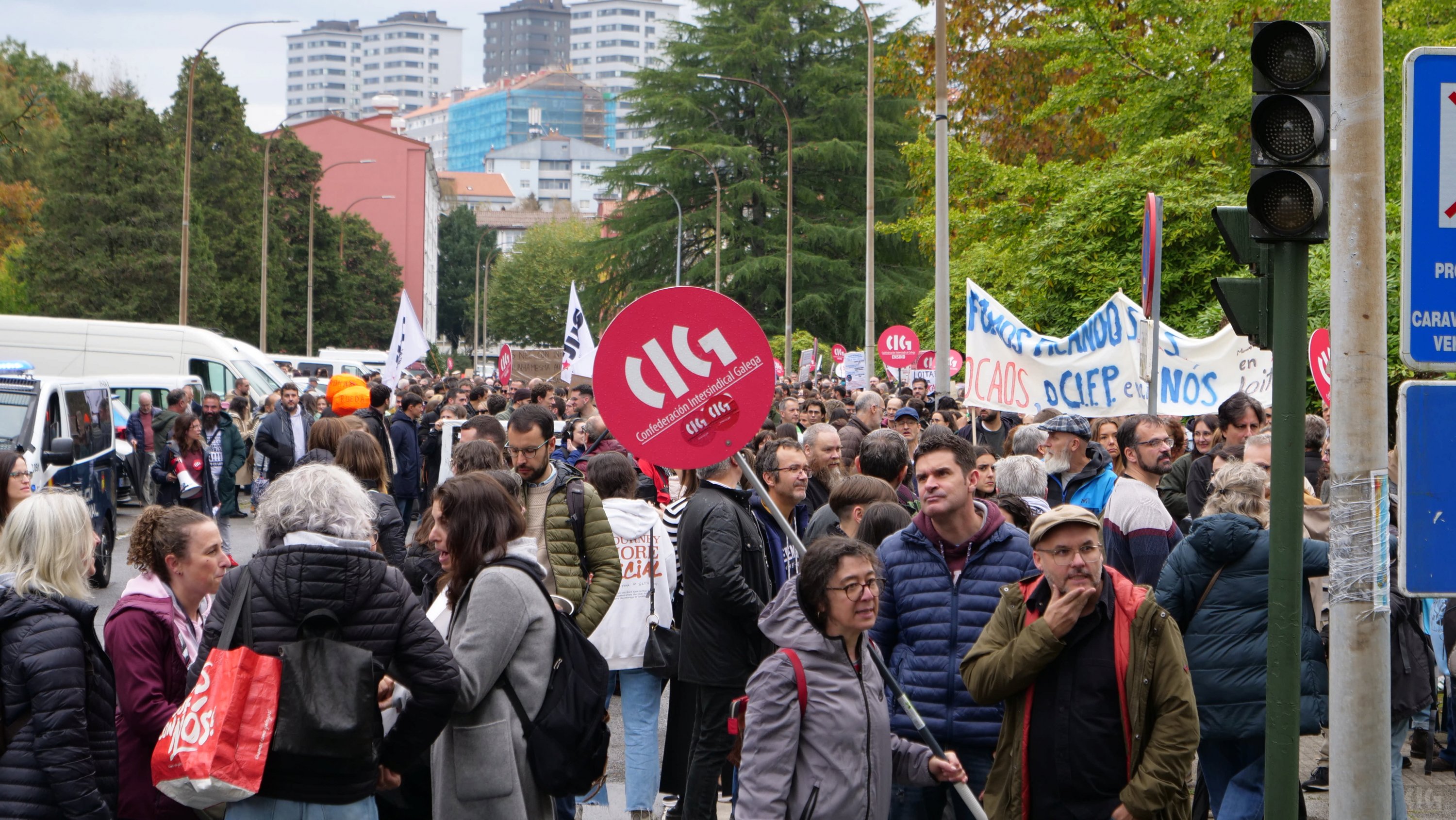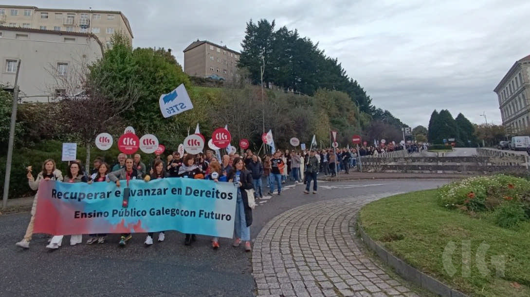 A primeira xornada da folga docente este mes de outubro, a segunda no que vai de curso, decorreu cun importante seguimento de profesorado, á espera de que se contrasten os datos de participación a partir do vindeiro xoves. O persoal docente, que estes días estivo moi activo nos propios centros colgando faixas reivindicativas e nas redes sociais, volveu hoxe responder masivamente á chamada de “virar San Caetano”, unha acción consistente en rodear o edificio administrativo da Xunta e que ante a afluencia de persoas tivo que ver modificado o percorrido previsto. Segundo explicou Laura Arroxo, secretaria nacional da CIG-Ensino, a organización maioritaria dentro do sector, “démoslle a volta á Consellaría porque o que se pretende é que esta lle dea a volta ás súas políticas e se poña do lado do profesorado, invista máis no público e non nas empresas privadas, aumente o número de docentes e non a burocracia, reduza o horario e as ratios e non recorte a nosa liberdade de cátedra como pretende”.