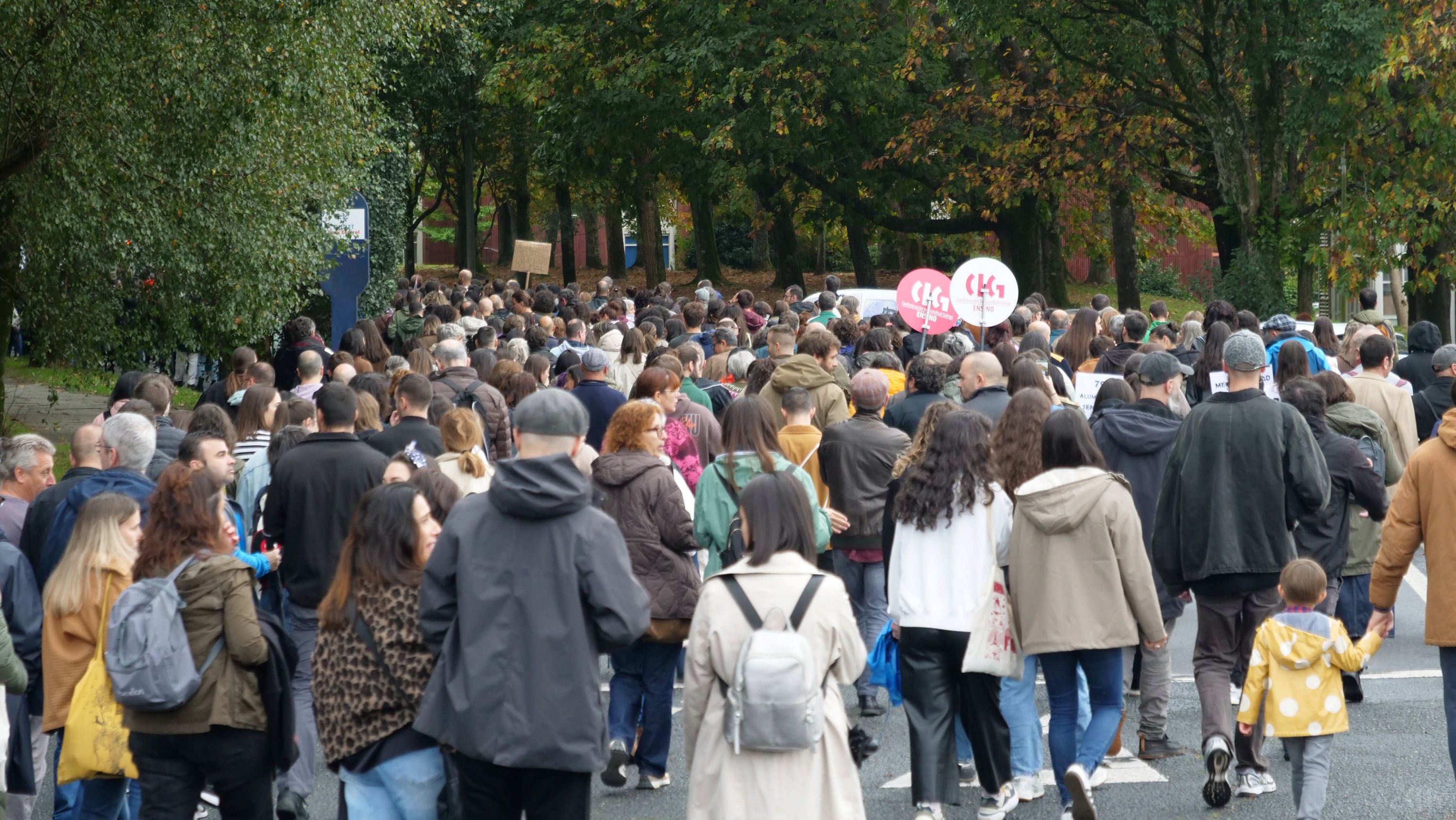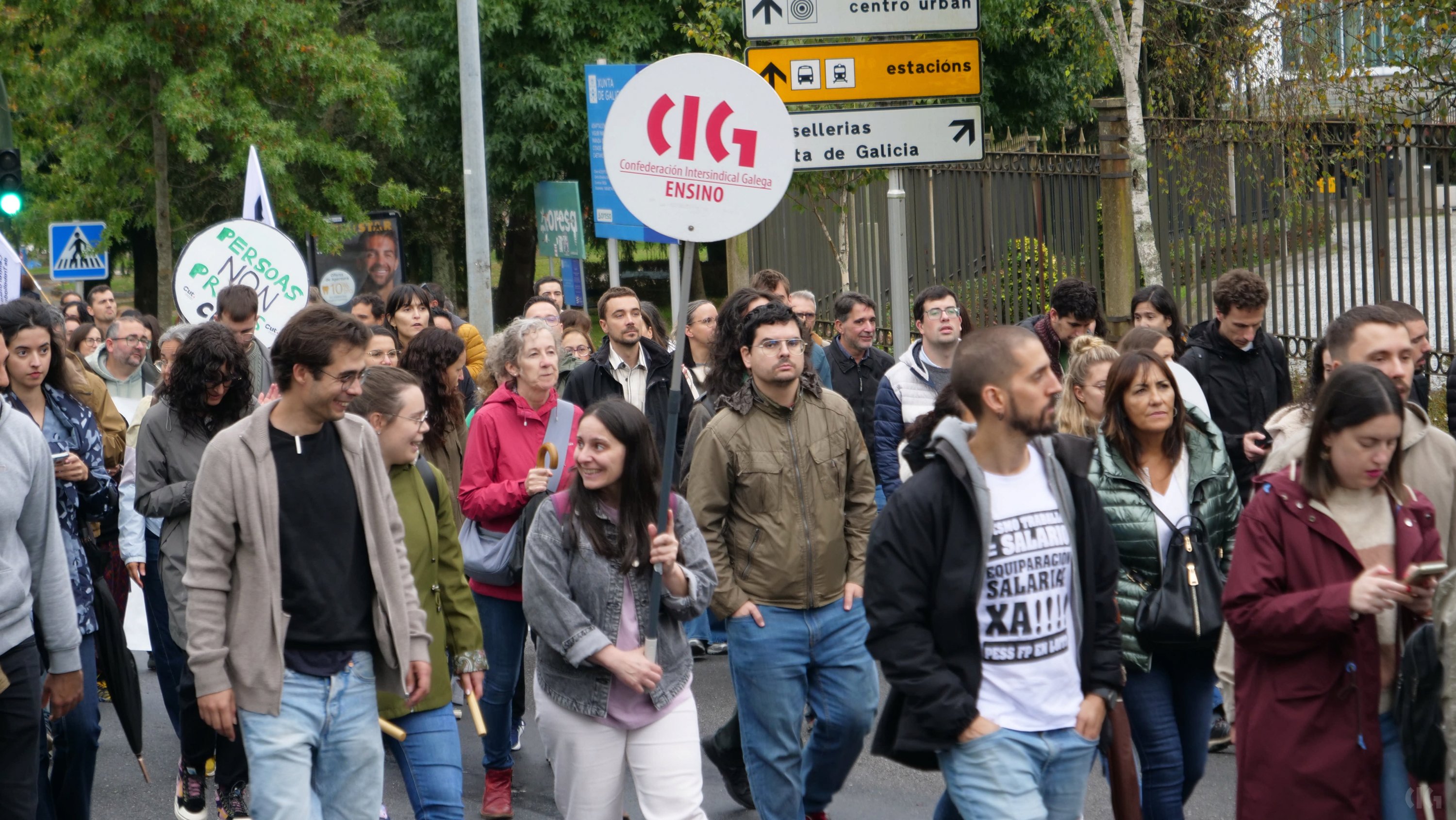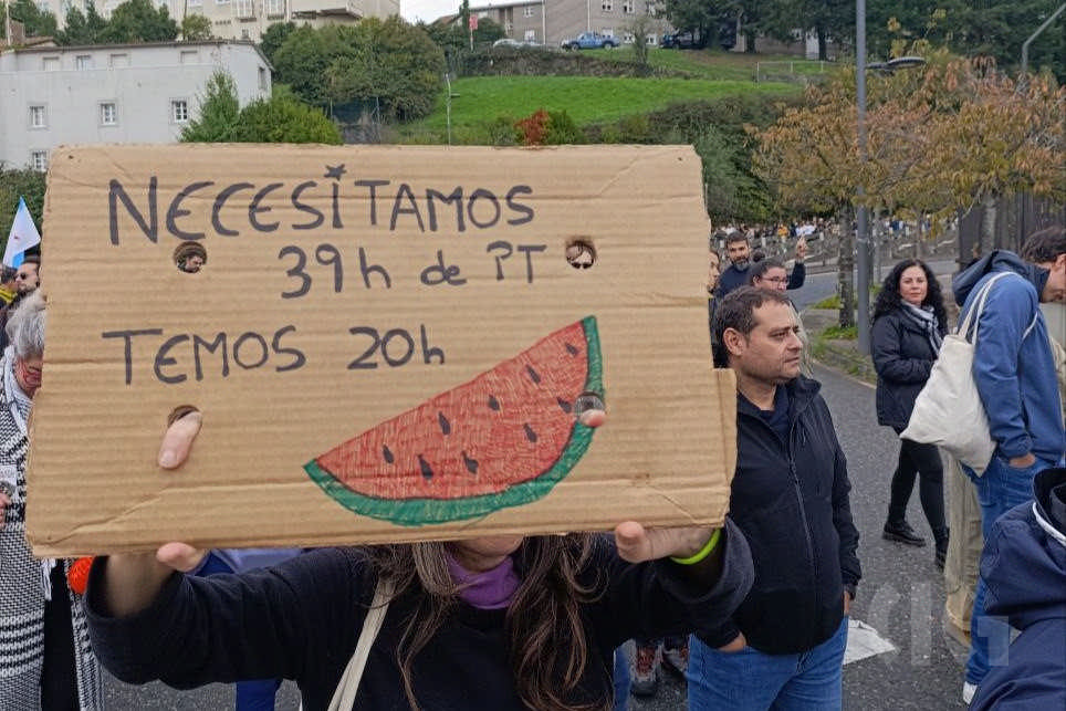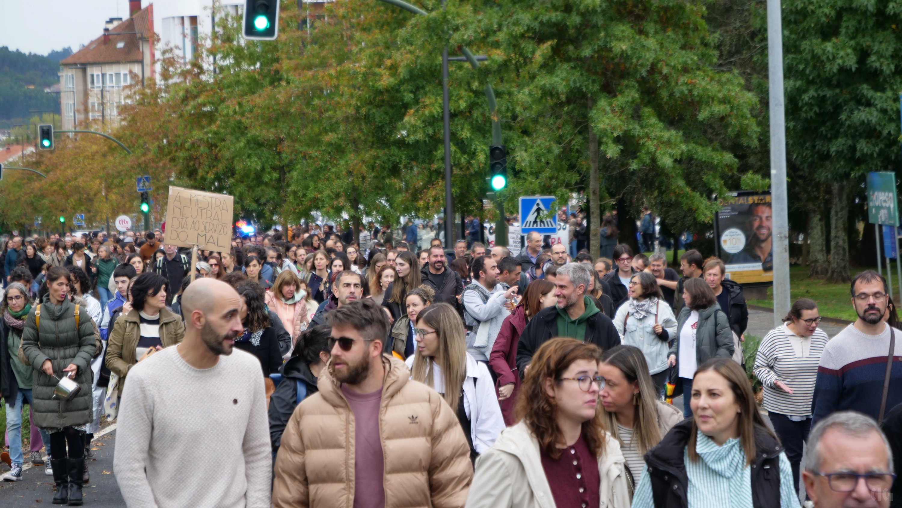 A primeira xornada da folga docente este mes de outubro, a segunda no que vai de curso, decorreu cun importante seguimento de profesorado, á espera de que se contrasten os datos de participación a partir do vindeiro xoves. O persoal docente, que estes días estivo moi activo nos propios centros colgando faixas reivindicativas e nas redes sociais, volveu hoxe responder masivamente á chamada de “virar San Caetano”, unha acción consistente en rodear o edificio administrativo da Xunta e que ante a afluencia de persoas tivo que ver modificado o percorrido previsto. Segundo explicou Laura Arroxo, secretaria nacional da CIG-Ensino, a organización maioritaria dentro do sector, “démoslle a volta á Consellaría porque o que se pretende é que esta lle dea a volta ás súas políticas e se poña do lado do profesorado, invista máis no público e non nas empresas privadas, aumente o número de docentes e non a burocracia, reduza o horario e as ratios e non recorte a nosa liberdade de cátedra como pretende”.
