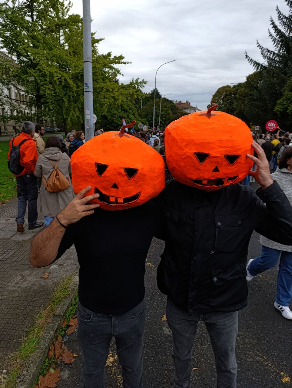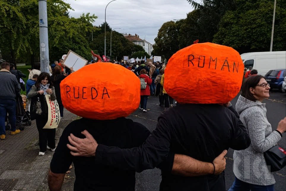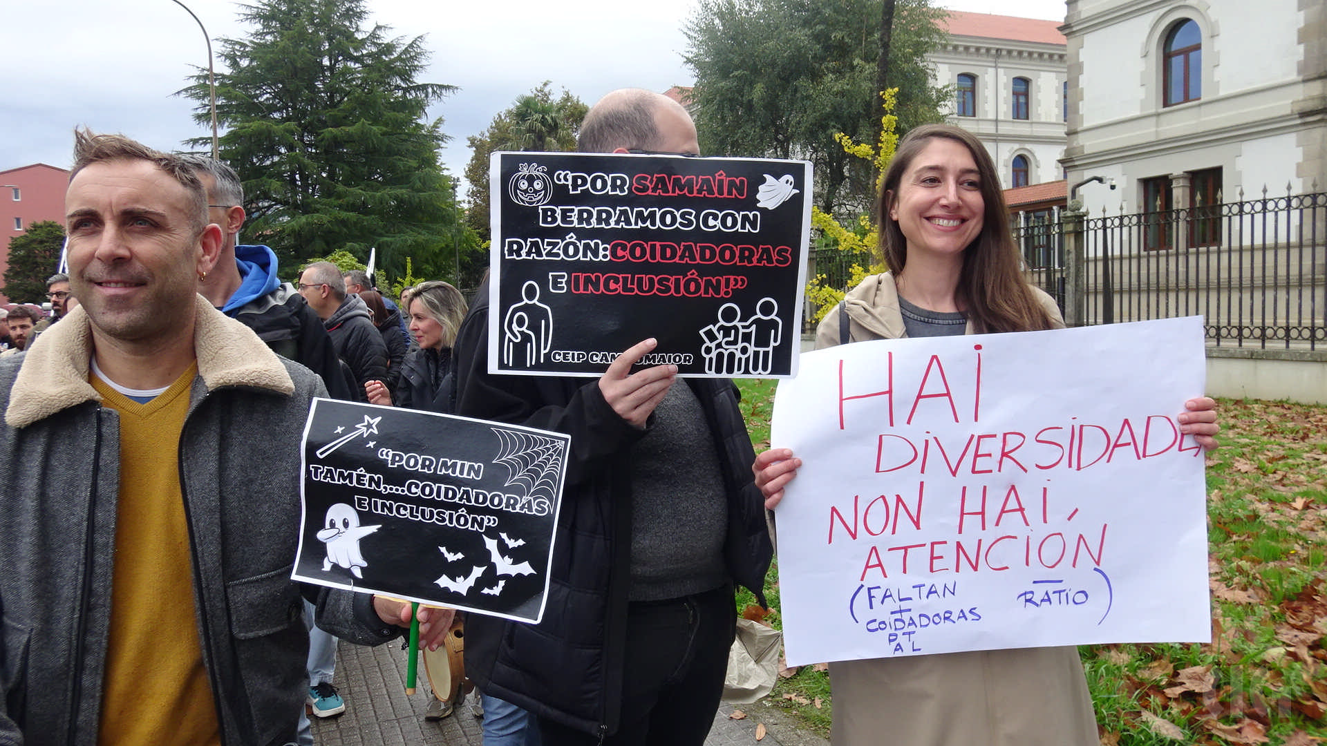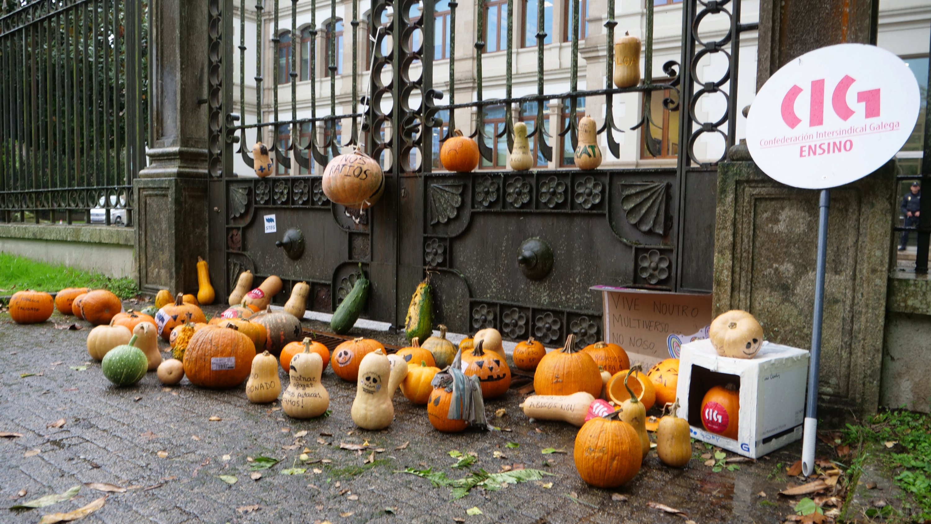 Durante a protesta moitas persoas portaron cabazas que se depositaron xusto diante da fachada da Consellaría de Educación. “Trouxémoslle cabazas ao conselleiro -engadiu- porque simboliza o suspenso por parte do profesorado porque non sabe sumar cando di que medio docente máis medio docente son dous docentes, suspende tamén na atención á diversidade ao pretender que unha persoa orientadora atenda a máis de 300 rapaces ou rapazas ou non dota os centros con especialistas de Pedagoxía Terapéutica e Audición e Linguaxe, cando non sabe colocar no mapa os coles do rural porque os deixa abandonados ou en lingua galega por someter ao ostracismo á nosa lingua”.