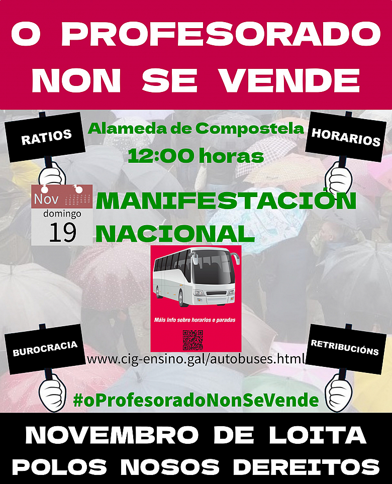 Para facilitar a asistencia á manifestación nacional a CIG-Ensino porá a disposición do profesorado autobuses, para ver os lugares de saída e anotarte podes entrar no seguinte formulario ou chamar a calquera dos nosos locais.