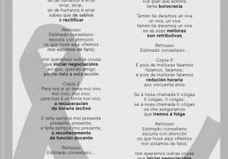 Ademais de animar a toda a comunidade educativa (alumnado menor de idade deberá ir acompañado por pai, nai ou titor/a legal) a participar nos peches que se van organizar en distintos centros de todo o país para, entre outras medidas, acordar novas accións reivindicativas, o martes 27 de xaneiro dan comezo os "martes en loita". Unha acción que pretende visibilizar no día a día dos colexios e institutos a necesidade de reducir ratios; de contar con máis persoal para atender a diversidade e con máis desdobres; de recuperar o horario lectivo; de reducir burocracia e de maior diálogo e negociación co profesorado. Para iso, ademais de vestir de negro tamén se pode elaborar cartelaría e outros materiais para empapelar os centros. Esta acción repetirase os tres martes antes do Entroido e o día 10 realizaranse concentracións en todos os centros de ensino portando mensaxes reivindicativas. Prégase que se compartan fotos e vídeos co correo galiza@cig-ensino.gal, ademais de nas redes sociais persoais e etiquetando ao sindicato.