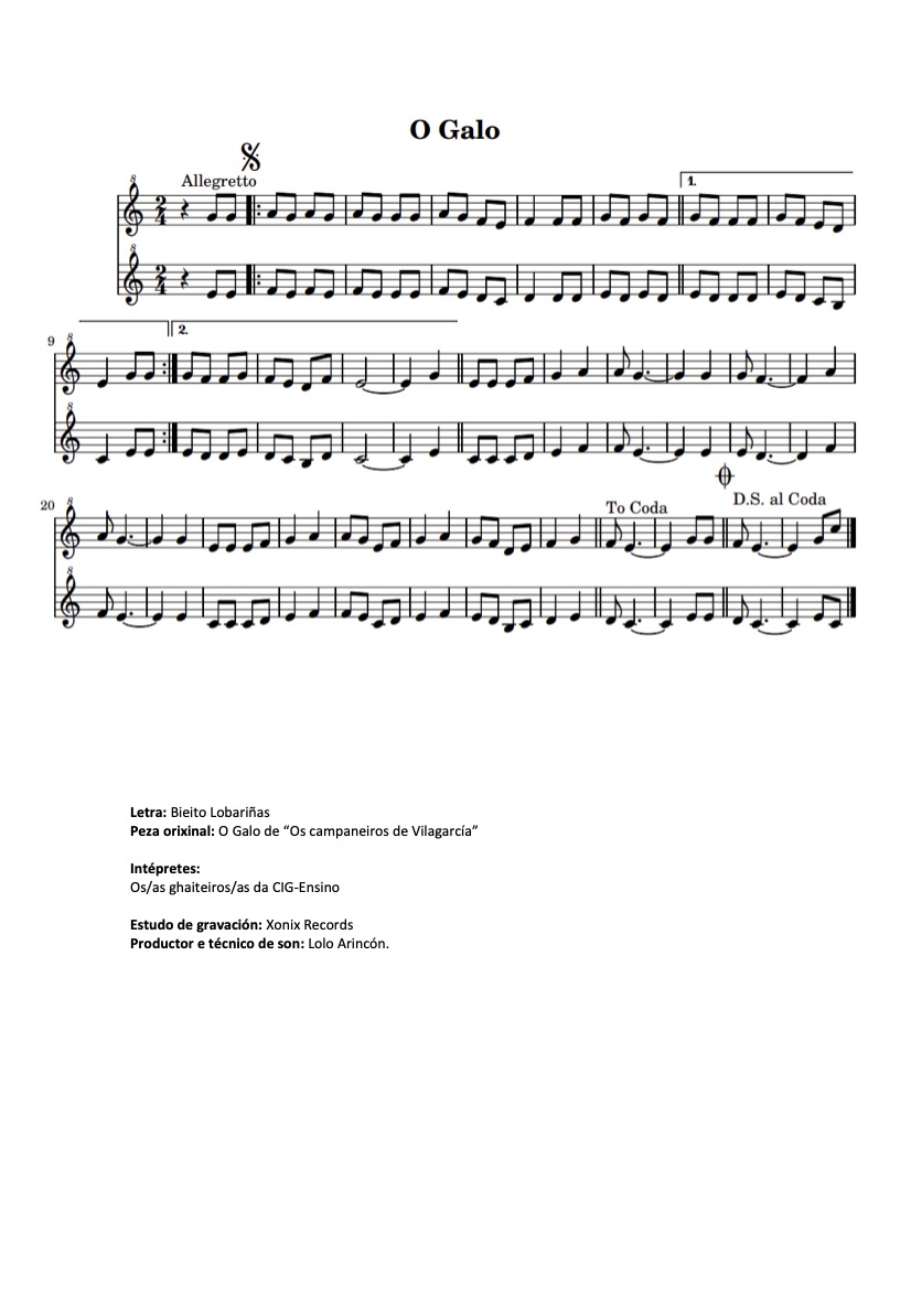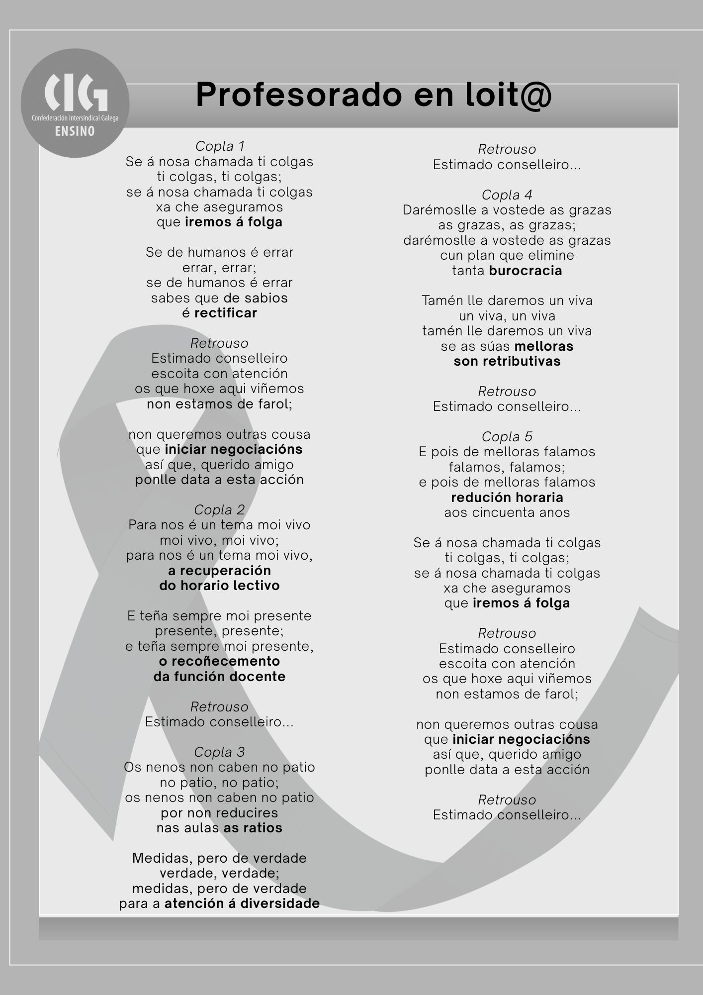 O sindicato propón que se cante a versión da peza "O Galo" dos Campaneiros de Vilagarcía, que xa soou na manifestación do 17 de decembro diante de San Caetano. A peza pode ensaiarse durante os "martes en loita" e interpretarse o día 10 cando se celebren as concentracións nos centros como unha forma de homenaxe á nosa música tradicional, recoñecida o ano pasado polo Día das Letras e que, xunto co baile tradicional, veñen de seren declarados “Ben de Interese Cultural” pola Xunta. Mediante esta reivindicación tamén se estaría a esixir que o goberno galego se tome en serio o ensino público galego declarándoo “Ben de Interese XERAL" e dotándoo dos recursos necesarios para o seu bo funcionamento.