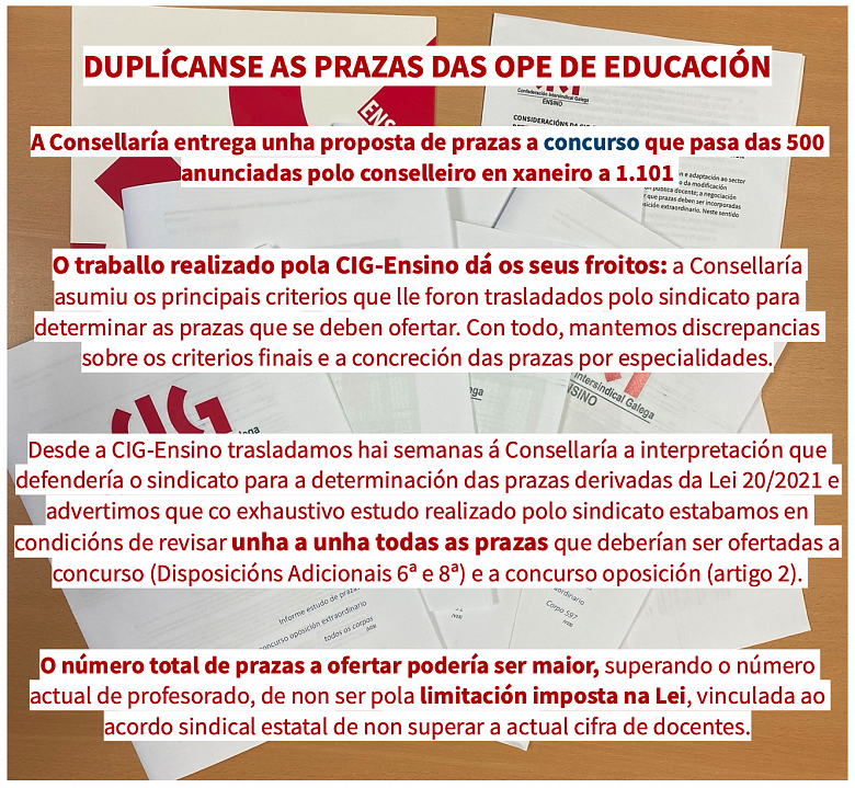 O día 11 de xaneiro, xusto antes de anunciar o conselleiro as prazas a convocar nas oposicións que terán lugar este mes de xuño, os responsábeis da Consellaría reúnense coa CIG-Ensino. Nesa reunión a CIG-Ensino anuncia que está a facer un estudo sobre como se deberían determinar as prazas derivadas da Lei 20/2021. Os datos, aínda provisionais, apuntaban a unha oferta que debería duplicar, como mínimo, a cifra anunciada ese día polo conselleiro e así o fixemos público. A Consellaría afirma que os seus datos son moi diferentes aos nosos e que non superan as 500-600 prazas.