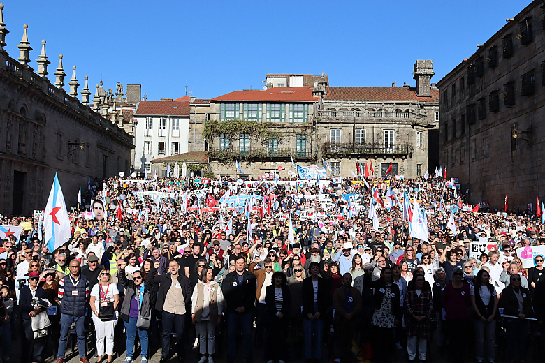 A Praza da Quintana fíxose pequena para acoller aos milleiros de persoas chegadas de todos os recunchos do país en defensa do noso principal sinal de identidade: a lingua herdada das nosas ancestras, a que nos constrúe como pobo e a que nos permite comunicarnos entre nós e co mundo que nos rodea. Milleiros de persoas encoraxadas para manifestar, con rotundidade, que non se poden permitir máis pasos atrás e que, como dicía o lema do multitudinario acto, hai que “mudar o rumbo do galego”.