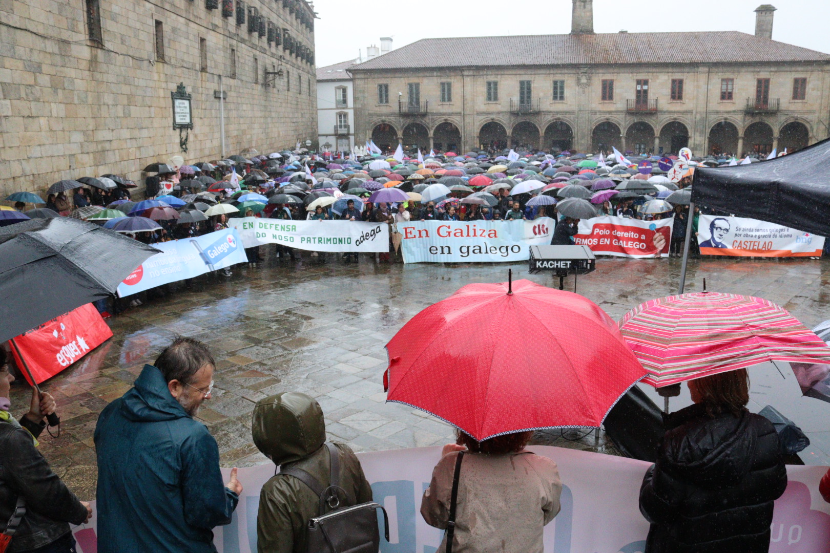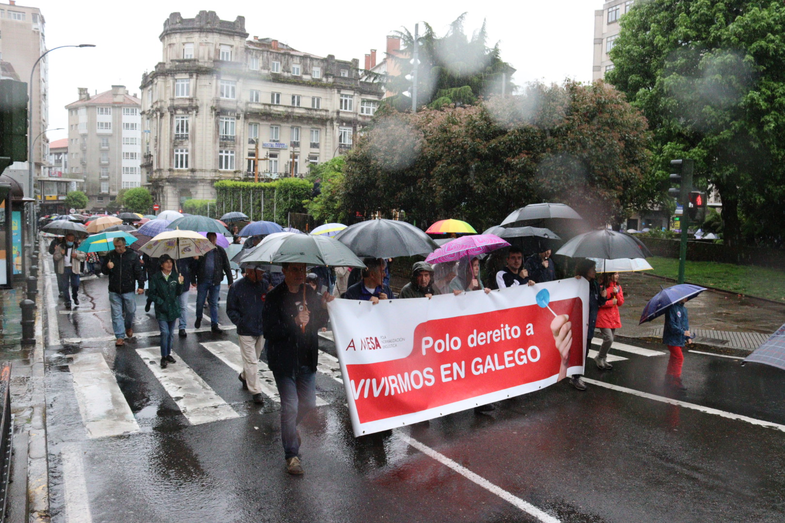 Baixo unha intensa e persistente choiva, milleiros de persoas tomaron as rúas de Compostela para celebrar o Día das Letras Galegas mais tamén para reivindicar “un novo futuro para a lingua” e reclamar o dereito a vivir en galego “agora e sempre”. A manifestación partiu da Alameda compostelá e rematou na praza da Quintana. Un percorrido no que as e os manifestantes proclamaron, máis unha vez: “Na Galiza, en galego”.