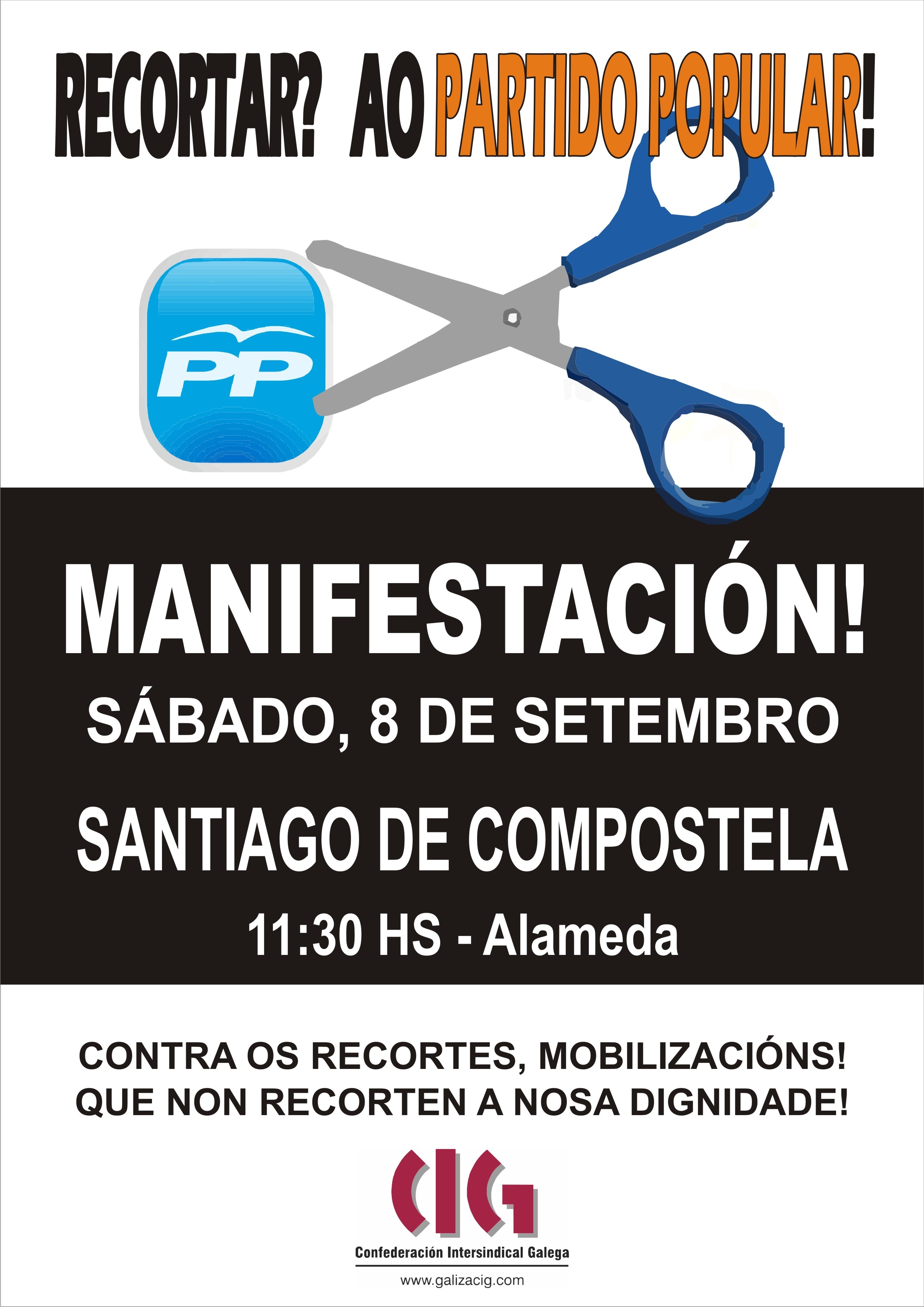 A CIG fai un chamamento a todas as empregadas e empregados públicos a participar na manifestación nacional convocada para o 8 de setembro en defensa dos sectores públicos e dos nosos dereitos laborais, con saída ás 11:00 horas da Alameda de Compostela e nas concentracións diante dos centros de traballo todos os xoves entre as 11 e 12 horas. Neste mesmo CIG Informa tes un cadro explicando como queda a nosa situación en canto ás baixas laborais.