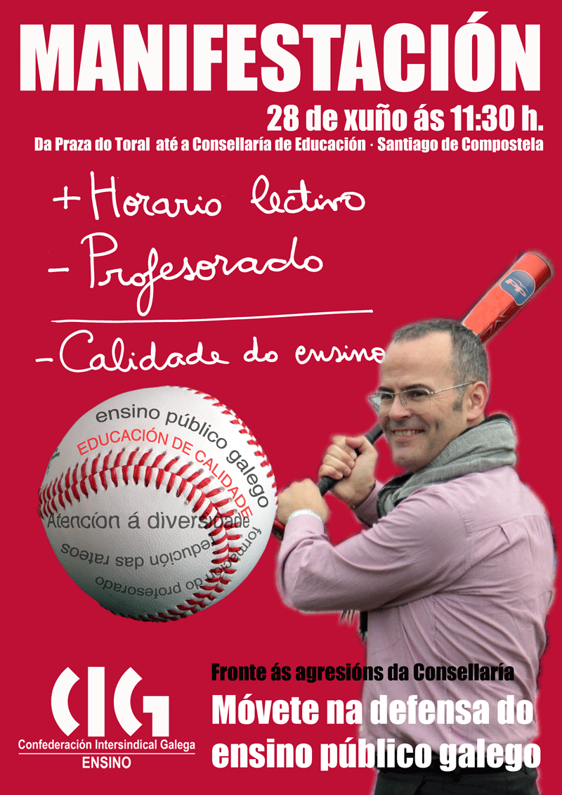 Modelos de resolucións dos claustros e consellos escolares esixindo a retirada da proposta de incremento de horario lectivo, e cartel da convocatoria de manifestación