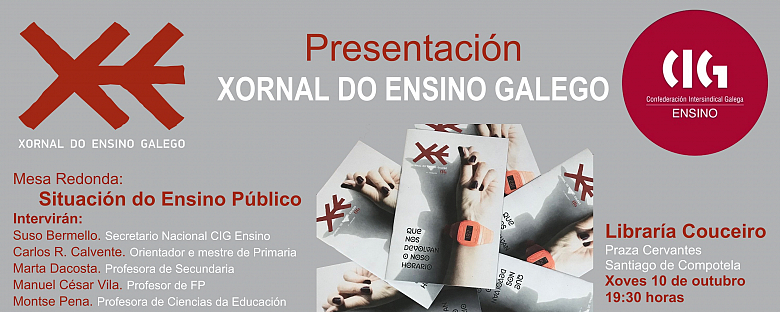 Para dar a coñecer en sociedade esta publicación, a CIG-Ensino ten organizado un acto de presentación o vindeiro xoves, 10 de outubro, ás 19:30 horas na Libraría Couceiro no que participarán o secretario nacional Suso Bermello, a escritora e profesora de Lingua de secundaria, Marta Dacosta, o orientador e mestre de primaria, Carlos R. Calvente, o profesor de FP, Manuel César Vila e a profesora de Ciencias da Educación, Montse Pena.