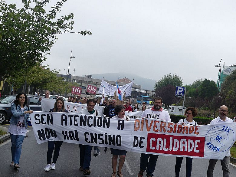 Nais e pais do IES de Brión apoiados pola CIG-Ensino concentráronse esta mañá diante da consellaría de Educación en demanda de “máis docentes, para un ensino decente”. Advertiron á nova conselleira de educación, Carmen Pomar que “Brión non vai parar” e anunciaron que seguirán mobilizándose en demanda de que se recupere todo o que se recortou no centro tanto para este curso como para os vindeiros. A CIG-Ensino ten convocada unha asemblea de profesorado para o vindeiro luns.
