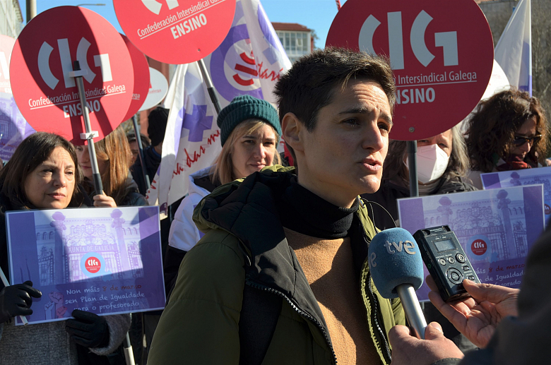 Para a diagnose e a corrección das desigualdades que se producen, a elaboración e execución dun Plan de igualdade docente é unha ferramenta fundamental, mais a administración educativa non tivo intención de negocialo, pese a que o texto refundido do EBEP, aprobado polo Real Decreto Lexislativo 5/2015, do 30 de outubro, expresa a obriga das administracións públicas de elaborar dito plan e de desenvolvelo no acordo de condicións de traballo do seu persoal. A CIG-Ensino reclamou en varias ocasións, por escrito, na Mesa Sectorial e nas reunións co conselleiro de Educación, o inicio dos trámites para a constitución da comisión de negociación, sen resposta algunha. Esta mañá un grupo de delegadas e delegados do sindicato maioritario no ensino público galego concentrouse diante da sede da Consellaría en San Caetano para esixir que este sexa o último Día internacional da Muller Traballadora, que se conmemora o 8 de marzo, sen contar con esta medida no ensino público. No acto interveu a responsábel de Mulleres da CIG-Ensino, Maruxa Martínez.