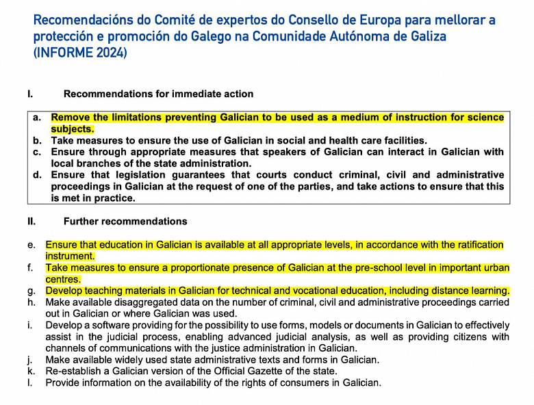 O informe do Consello de Europa é claro ao respecto desta realidade e identifica aqueles aspectos nos que o estado español (neste caso por vía do goberno galego como competente nas políticas lingüísticas no ensino) incumpre reiteradamente a Carta Europea das Linguas Rexionais ou Minoritarias, de obrigado cumprimento desde hai máis de dúas décadas. Así, no seu informe o Comité salienta: