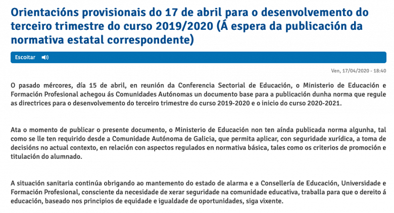 Por iso desde a CIG-Ensino non podemos aceptar que a administración galega se escude no retraso da administración do Estado Español para non dar instrucións claras ao profesorado galego, cando moito do dito nestas instrucións, nomeadamente todo o referente ao apoio aos centros educativos, podía terse ditado o día 13 de marzo. É certo que ambas administracións están chegando tarde e de forma descoordinada, mais non é menos certo que as instrucións á comunidade educativa galega teñen que partir da Consellaría e non as están dando en tempo e forma.