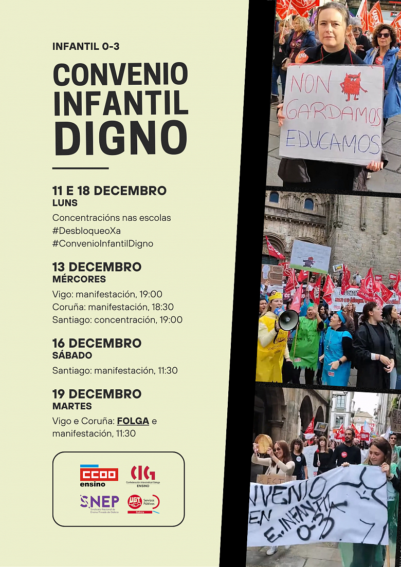 Así, as OOSS, en representación do persoal traballador de infantil de 0 a 3 anos, organizarán varias manifestacións e concentracións no mes de decembro nas grandes cidades de Galiza. A primeira das mobilizacións arrincará o mércores 13 en Vigo, Santiago e A Coruña. Tamén se convocará xornada de folga o martes 19 de decembro. Os sindicatos convocantes continúan manifestando deste xeito o malestar coa marcha das negociacións, que se iniciaron hai máis dun ano e medio, nas que as patronais non souberon estar á altura das necesidades do sector.