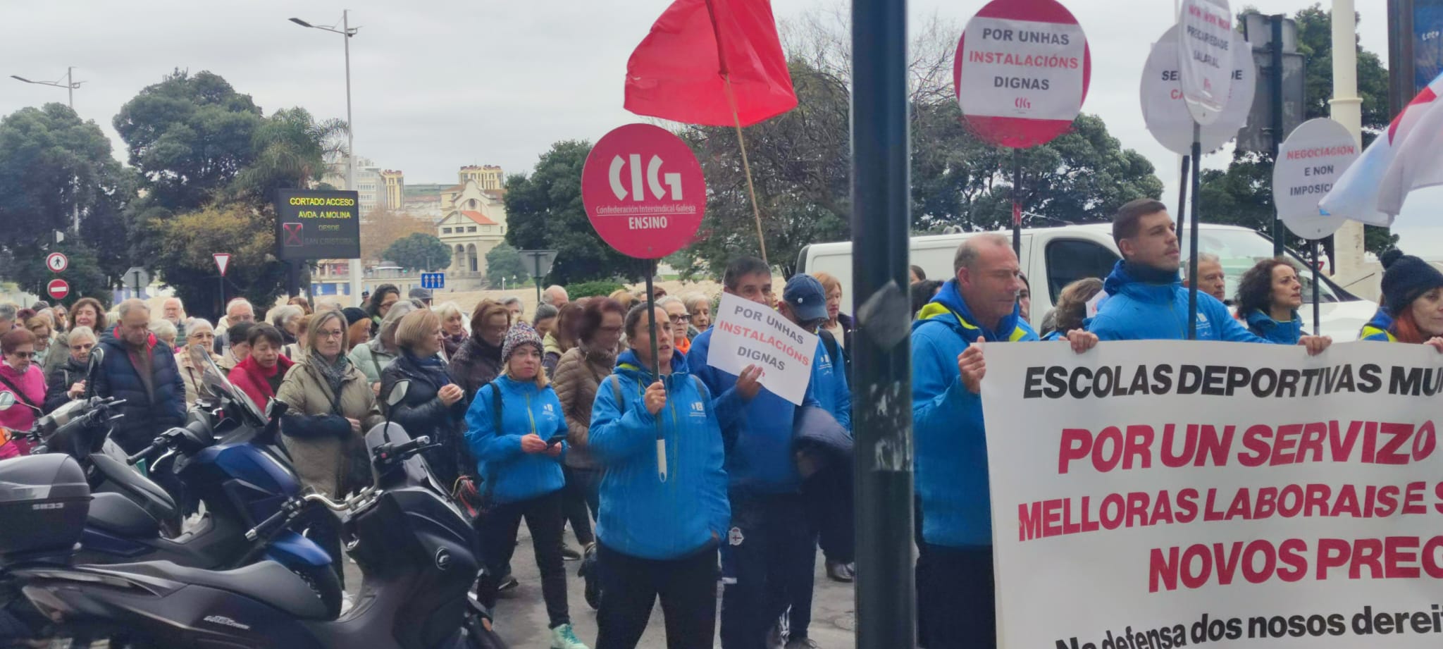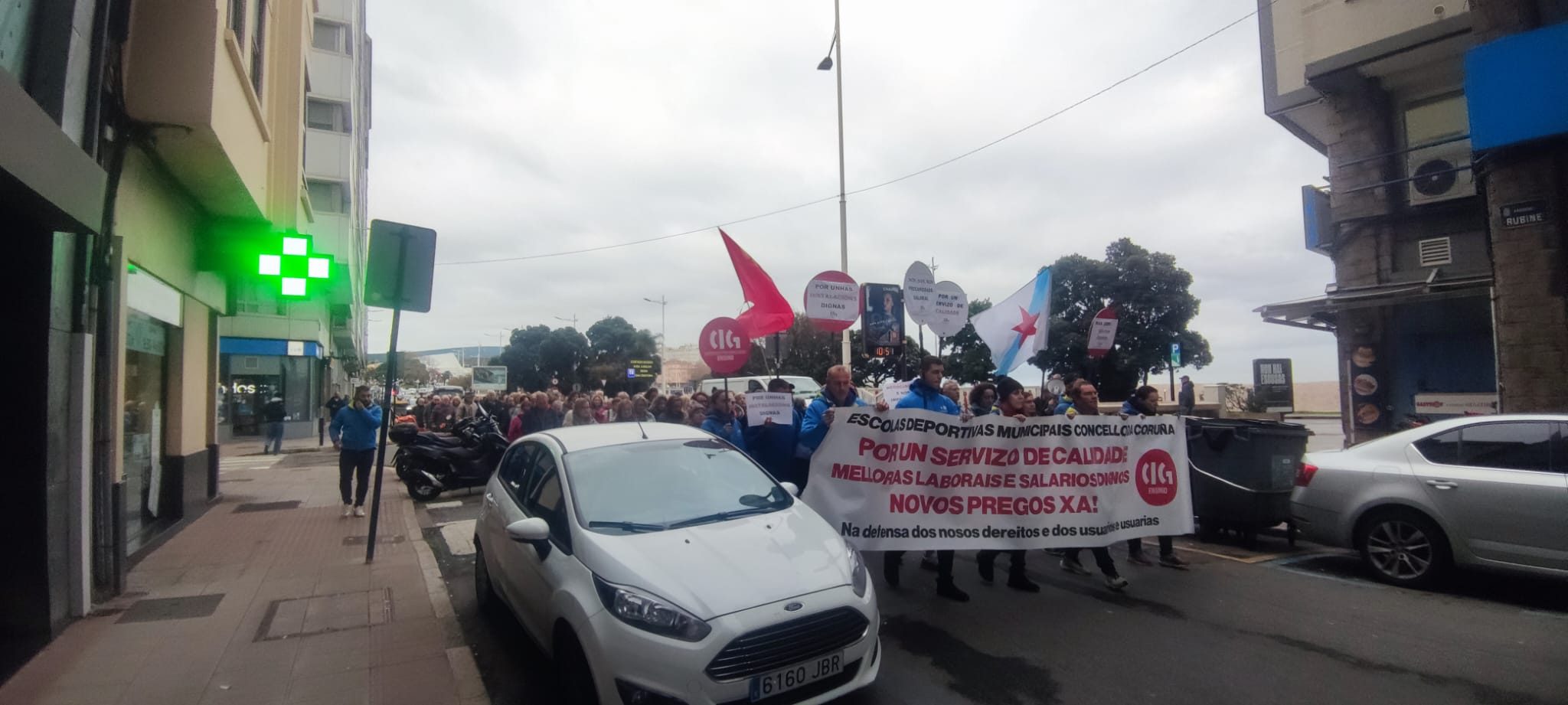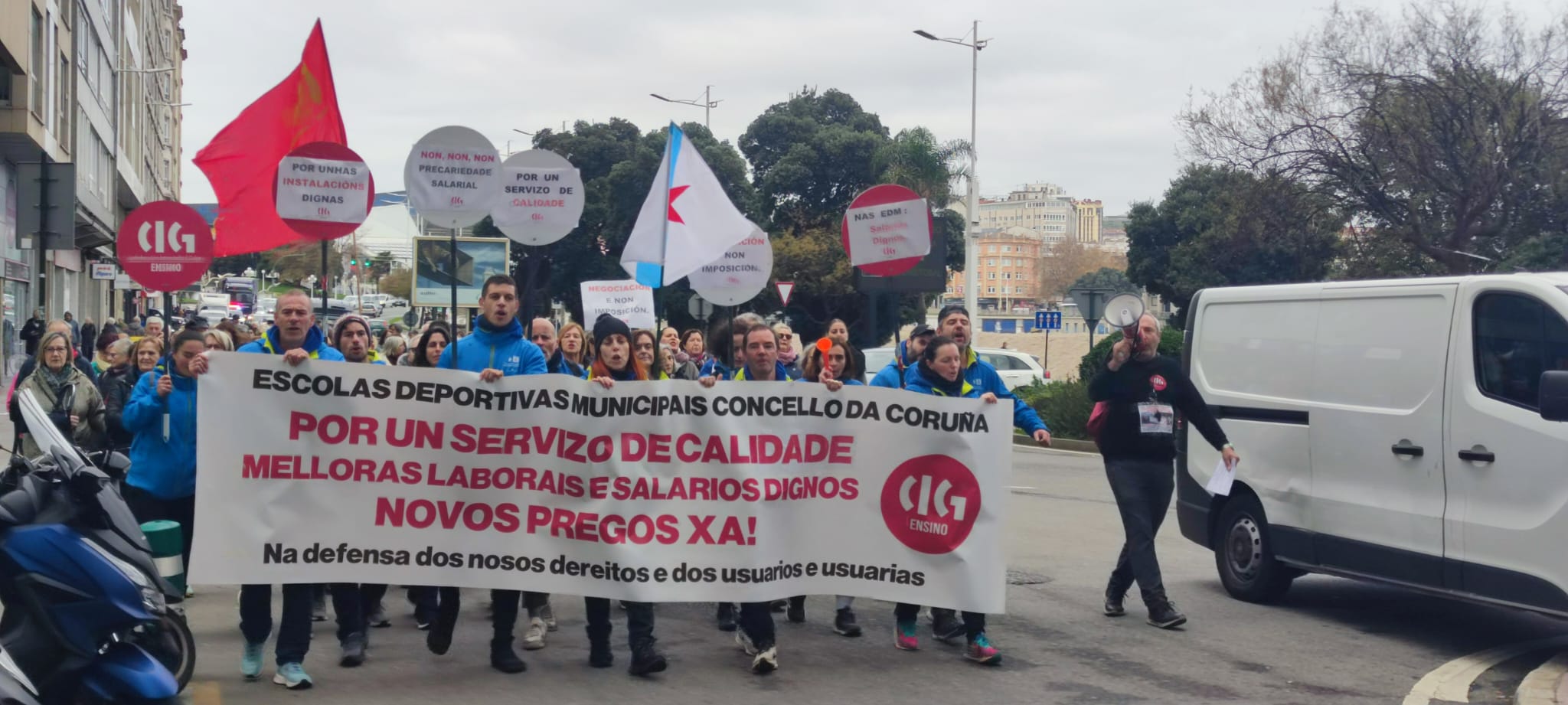 O 100% do cadro de persoal das Escolas Deportivas da Coruña (servizo adxudicado á empresa Serviplus) secundou este xoves a folga de tres horas convocada para reclamar a dignificación laboral e que o Concello respecte o compromiso para avanzar na mellora das condicións económicas e de traballo no seguinte prego da concesión.