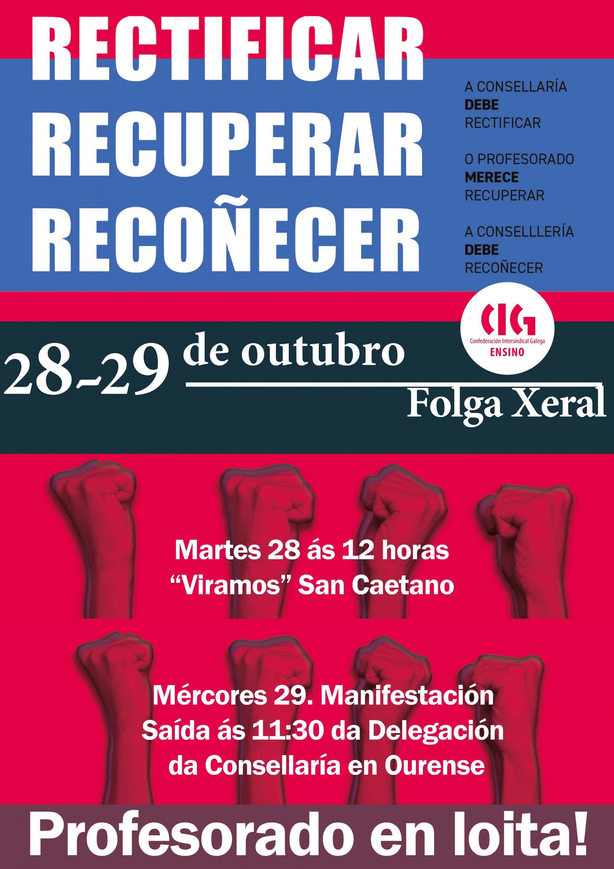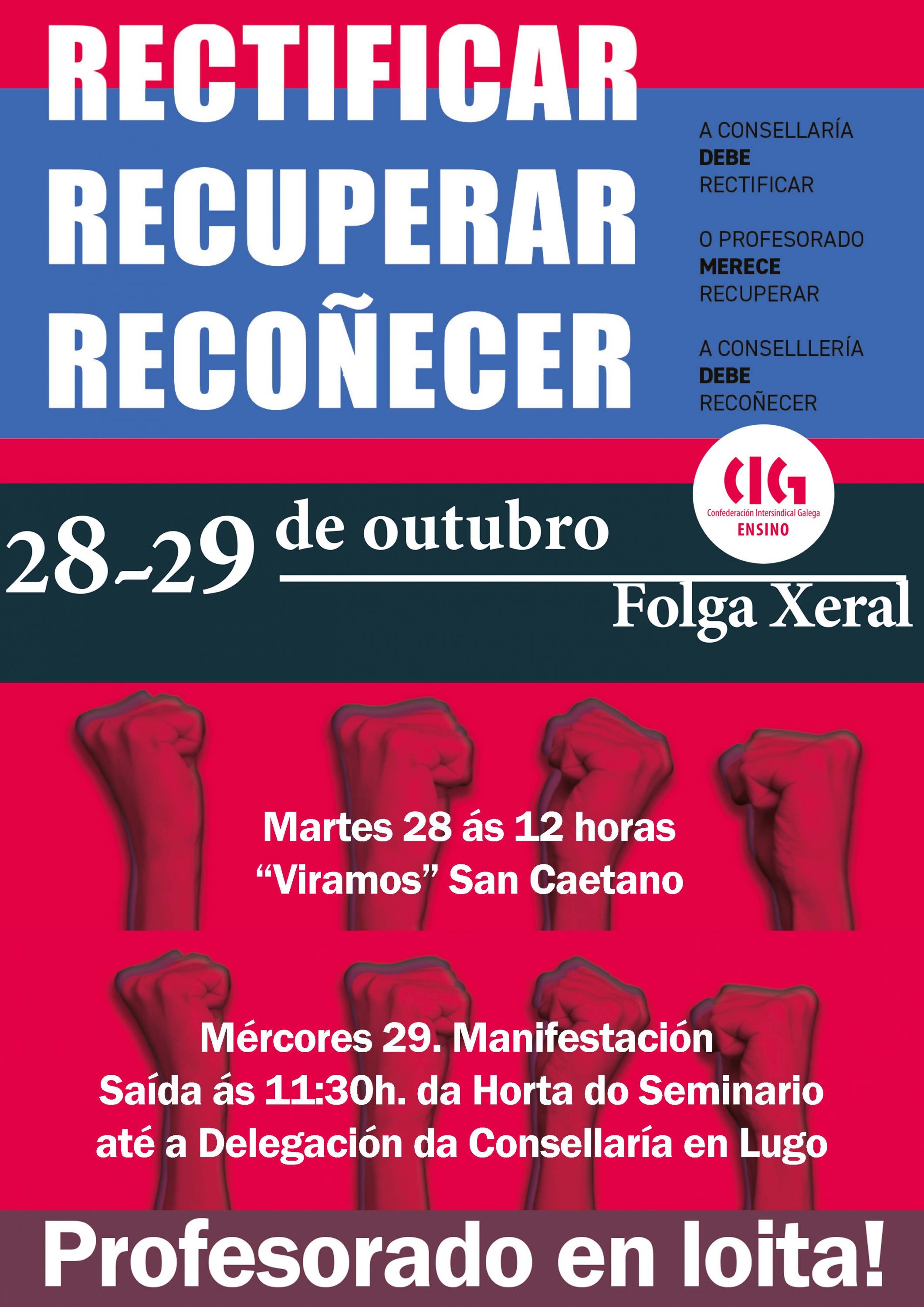 A CIG-Ensino convoca mobilizacións para as dúas xornadas de folga os próximos días 28 e 29 de outubro que consistirán o martes nunha acción que denominan “Imos virar San Caetano e facernos escoitar” e o mércores en manifestacións descentralizadas nas catro capitais de provincia e que rematarán diante das Delegacións Territoriais da Consellaría de Educación. No primeiro caso trátase dunha cadea humana en movemento que pretende simbolicamente forzar á administración galega a darlle un xiro ás súas políticas, rectificando os recortes dos últimos anos para que o profesorado recupere os seus dereitos e se vexa recoñecido como merece. A CIG-Ensino propón ás persoas asistentes que fagan ruído a modo de cazolada tamén para facerse escoitar levando as tradicionais potas e cazos pero tamén materiais de uso educativo habituais como pitos, xogos educativos, instrumentos musicais, ferramentas de ciclos formativos... para levar o ambiente sonoro das aulas galegas ás rúas. Así mesmo, proponse que, aproveitando que está próximo o Samaín, o profesorado lle leve cabazas ao conselleiro en sinal de rexeitamento pola súa falta de diálogo, así como pancartas e faixas reivindicando a situación concreta do seu centro educativo ou colectivo ou xenérica pola mellora do ensino público. A convocatoria está fixada para as 12 da mañá e o sindicato porá servizo de buses para facilitar a asistencia do profesorado desde os distintos puntos de Galiza.