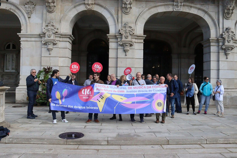 Ao berro de "Concello escoita, a música é a nosa loita", o persoal da Escola Municipal de Música da Coruña concentrouse este mércores na Praza de María Pita. Esta é a cuarta mobilización que as traballadoras e os traballadores realizan en demanda da xestión pública directa da escola, para exixir que se asigne un orzamento suficiente para garantir unha educación de calidade e tamén para que se respecten os dereitos laborais e se abonen dunha vez os atrasos pendentes.