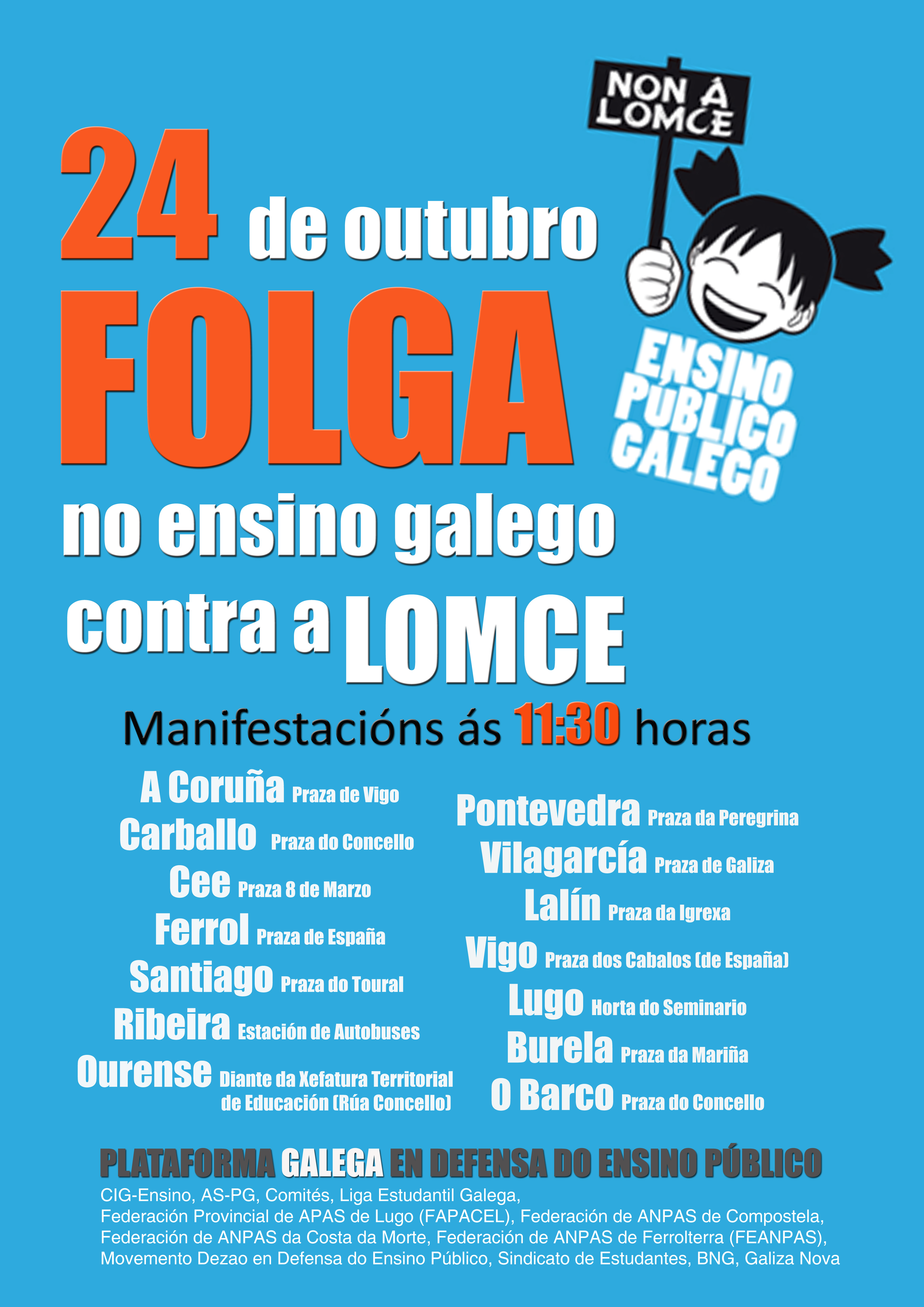 Por esta razón a CIG-Ensino considera máis necesario que nunca participar activamente na convocatoria de folga e nas manifestacións do 24 de outubro pola mañá para paralizala e evitar a súa aprobación e para que se evidencie, unha vez máis e de xeito contundente, a oposición da sociedade galega á LOMCE.