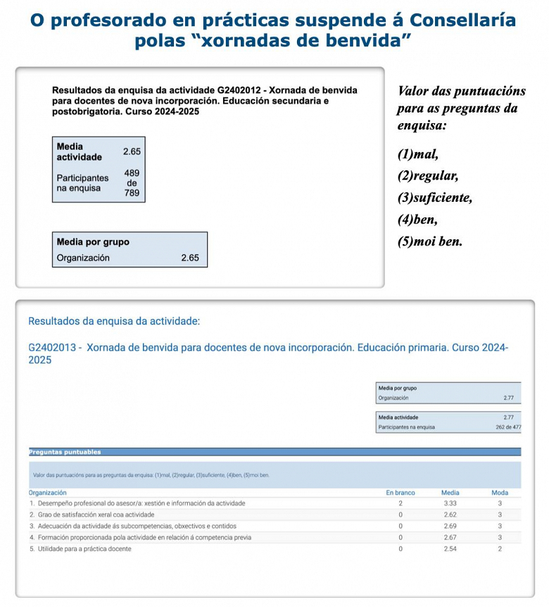 As valoracións e as notas medidas son practicamente idénticas, un 2,65 en Secundaria e un 2,77 en Primaria, sendo a nota de 3 a que fixa o suficiente. Esta baixa valoración non é habitual en xornadas organizadas polo servizo de de formación do profesorado, o que tamén debería obrigar a reflexionar a quen tomou a decisión de pasear o conselleiro e os altos cargos nun acto destas características.