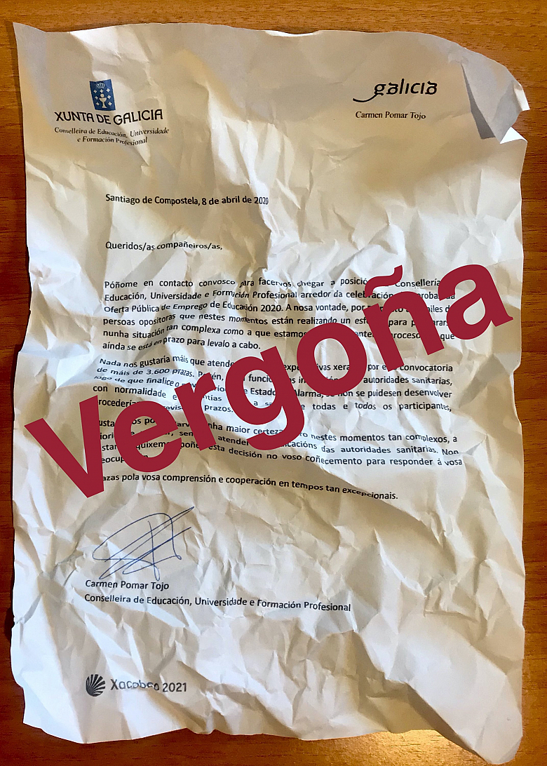 Coa carta emitida aos sindicatos esta mañá a conselleira de Educación demostra unha incongruencia total coa súa anterior comunicación ao respecto de que só se manterían as oposicións se se levantase o estado de alarma o vindeiro 11 de abril