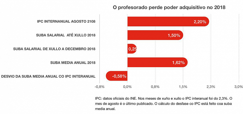 Na nómina que acabamos de recibir este mes consumouse a suba dun 0,25% con respecto ao incremento do 1,5% que recibimos de xaneiro a xuño, o que situará o incremento medio a finais deste ano só no 1,62%. Este acordo asinado polos sindicatos do Estado co anterior goberno Rajoy déixannos moi por baixo do IPC, que a finais deste mes de setembro xa está situado na cifra interanual no 2,2%. Constátase así o que desde a CIG-Ensino denunciamos na Mesa Xeral de Negociación das Administracións Públicas, que era un pésimo precedente desvincular os salarios do funcionariado público do IPC.