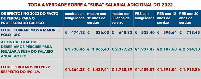 Se ollamos para un caso como o dunha docente de secundaria con 30 anos de experiencia o diferencial é moito maior. Cunha suba que non nos fixese perder poder adquisitivo (lembremos, non falamos de gañar máis do que sobe a vida, só de poñernos ao mesmo nivel) debería percibir 2.634,30€ en vez dos 718,45€ que vai percibir. Unha diferenza que se sitúa en 1.915,86€ e que amosa claramente como o persoal do sector público perde ao respecto do que aumentan os prezos dos alimentos, a luz, os carburantes ou as hipotecas. Esa depreciación dos nosos salarios dáse neste ano, e iso é o pero de todo, coa complicidade vergoñenta de UGT e CCOO.