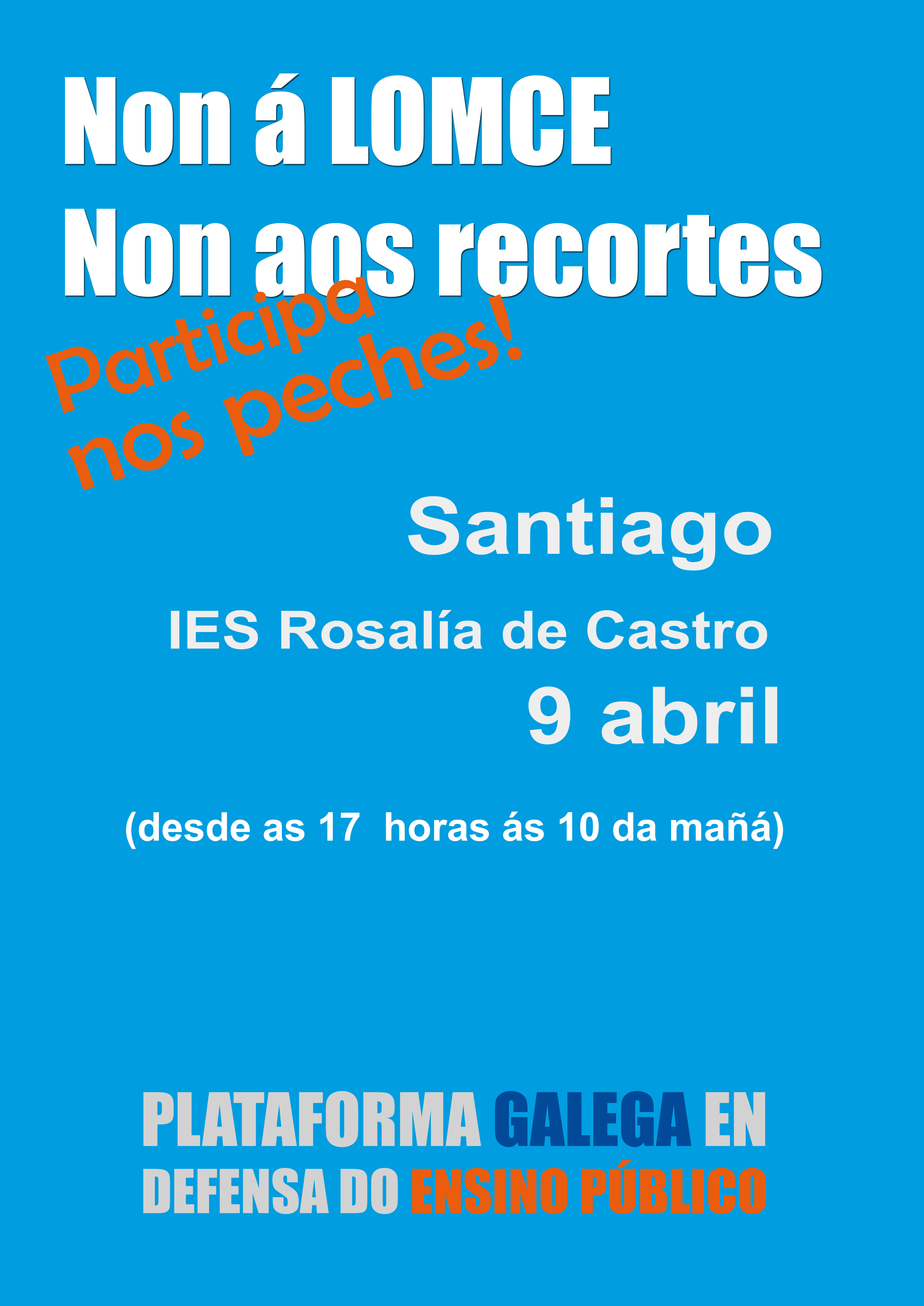 Estes peches teñen como obxectivo amosar o rexeitamento da comunidade educativa no seu conxunto ao anteproxecto de LOMCE e a política de recortes coa que o PP teima en castigar o ensino público galego. Os peches iranse sucedendo ao longo de todo o mes de abril nas datas e lugares que se indican de seguido: