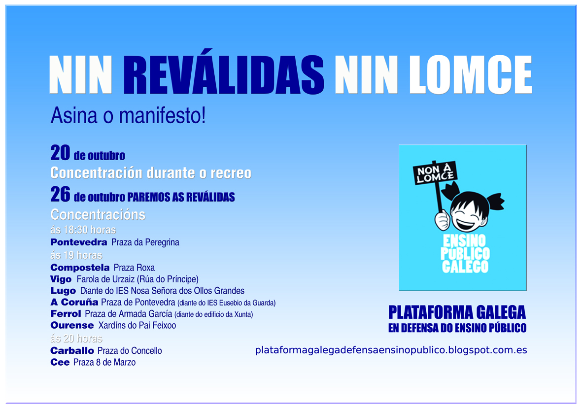 A PGDEP propón que se amose o rexeitamento ás reválidas con concentracións diante dos centros durante o recreo o 20 de outubro e participando nas convocadas para o mércores 26. Consulta no interior as horas e lugares de realización. Nesta nova podedes ver e ASINAR o manifesto "NON AS REVÁLIDAS" así como o resto de documentación da Campaña da Plataforma Galega en Defensa do Ensino Público contra as Reválidas e a LOMCE. Tamén atoparedes un CIG Informa da CIG Ensino sobre a campaña #NinReválidasNinLOMCE.