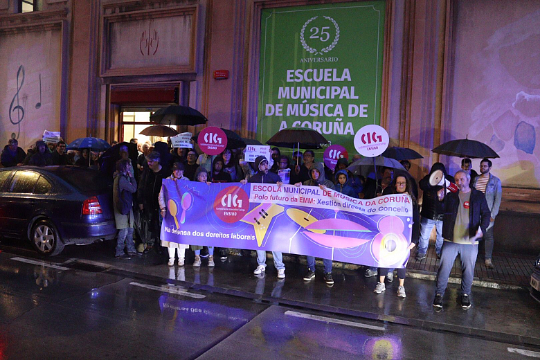 O persoal docente e de administración da Escola Municipal de Música da Coruña concentrouse na tarde do martes diante do centro educativo para reclamar a xestión directa por parte do Concello, que se lle asigne o orzamento necesario para ofertar unha ensinanza pública e de calidade e para demandar tamén que se cumpra co estabelecido no convenio colectivo.