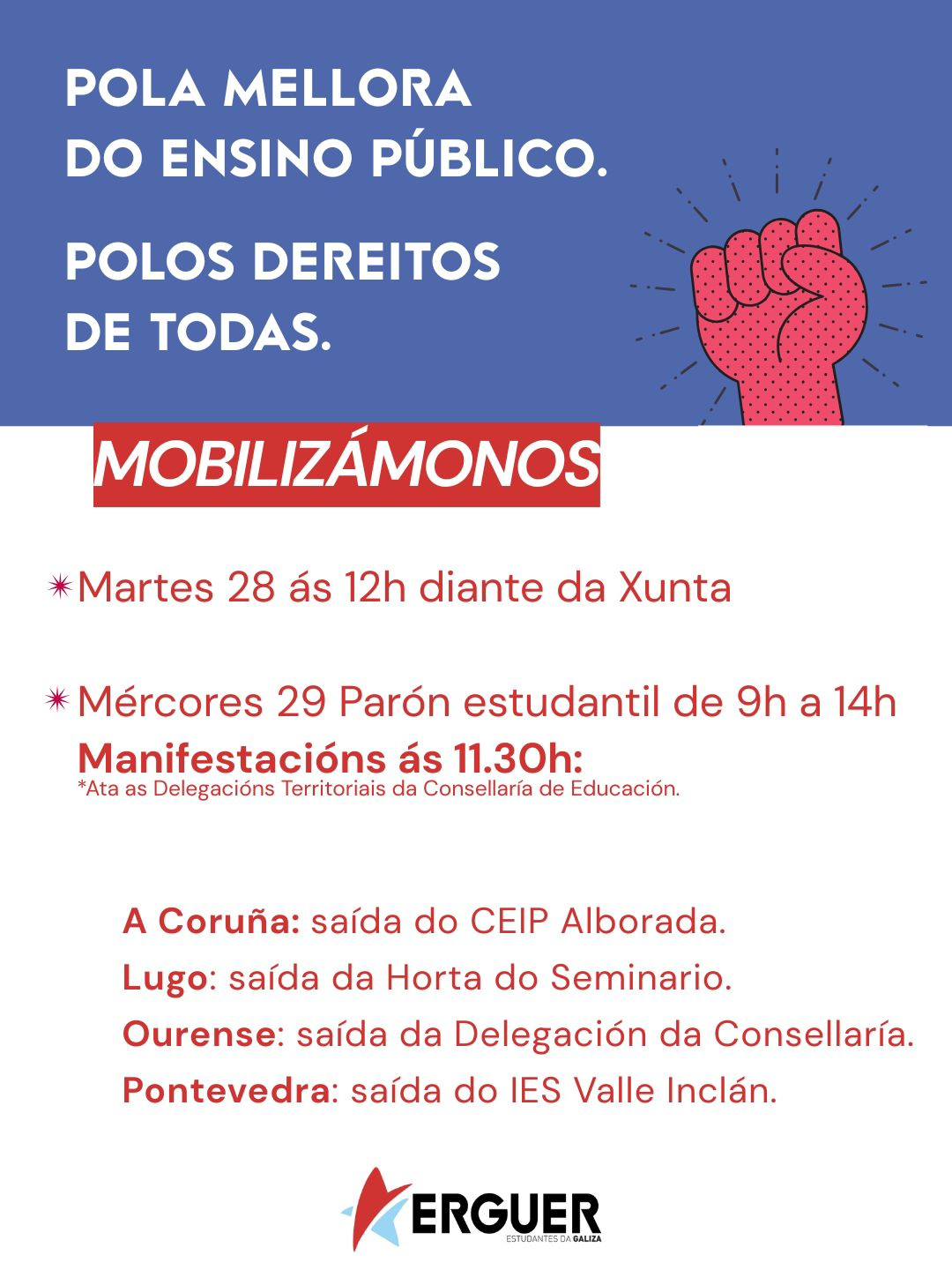 Estes días previos á folga tamén chegaron outras manifestacións de apoio desde o sindicato estudantil Erguer que convocou ao alumnado de ensino medio e de Formación Profesional a secundar o paro e acudir ás mobilizacións, tanto á manifestación de mañá de Santiago, ás 12 horas nas que se rodeará San Caetano en demanda dun xiro radical das políticas da Consellaría de Educación, como as das capitais das catro provincias que sairán ás 11:30 horas con final diante das delegacións territoriais, dos seguintes puntos: