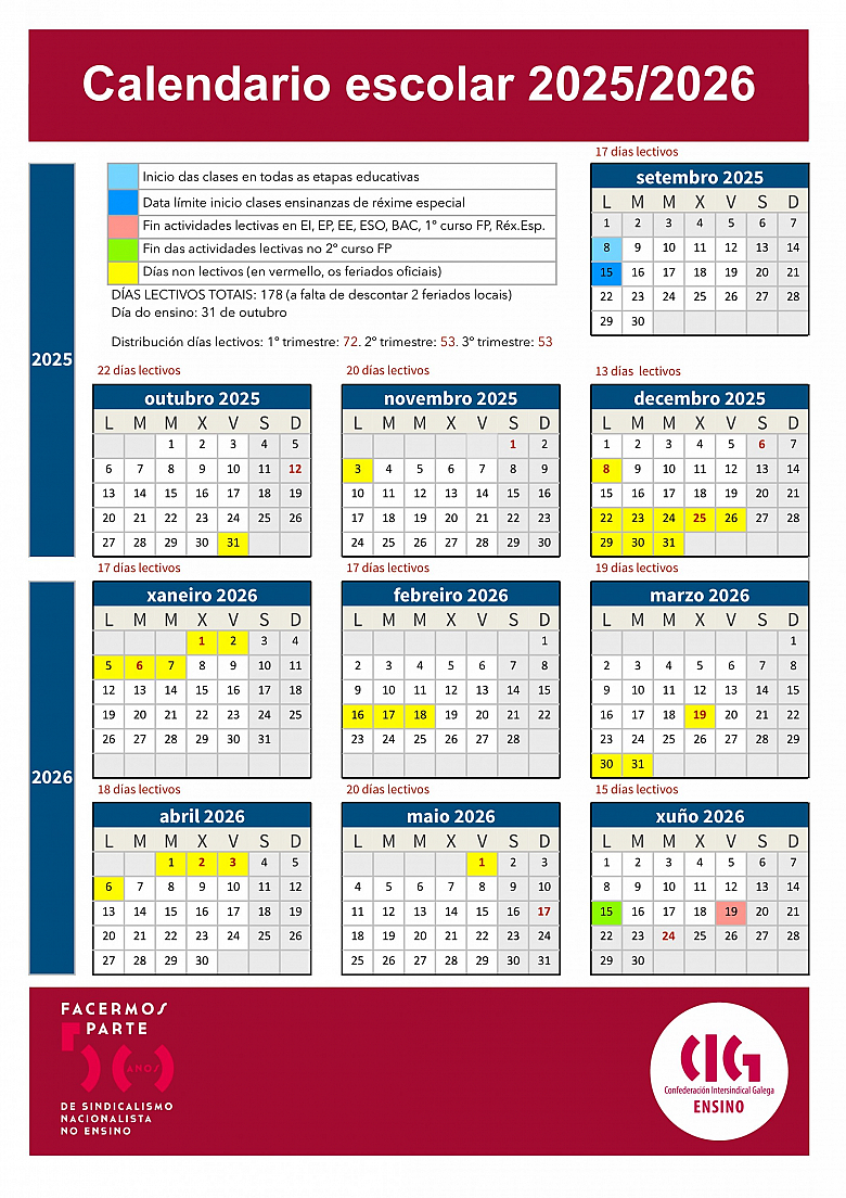 Desde a CIG-Ensino propoñíamos comezar as clases o día 10 de setembro, ao entender que non deberíamos pasar dos 175 días lectivos que fixa a LOMLOE e non seguir cos 176 que a Consellaría leva impoñendo os últimos anos, e retirando o día non lectivo que viña marcado para o 5 de decembro. Non só non atenderon esta petición da CIG que foi apoiada polo resto de sindicatos da Mesa Sectorial senón que mudaron eses día que pasa para o 3 de novembro sen ser tratado este cambio en ningún momento.